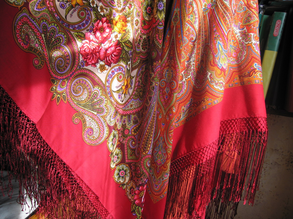 Бледный, нежный, с тонкой прорисовкой платок с бахромой. И яркий, насыщенный, с толстыми линиями - платок с оверлоком. Надо сказать, что именно этот платок привёл меня на platki.ru и ...всё - пропала.