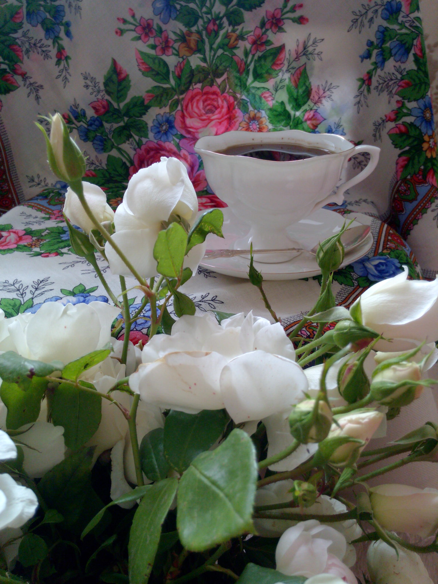 Вдоль по реченьки действительно с розами чайного цвета! А чашка цветёт теми же цветами, что и растущие вдоль реченьки. Спасибо, Белый шиповник!
