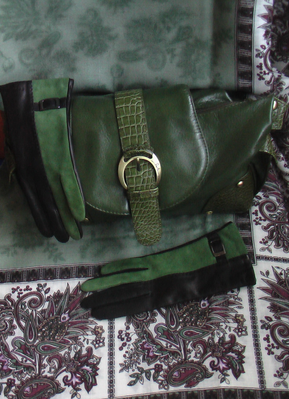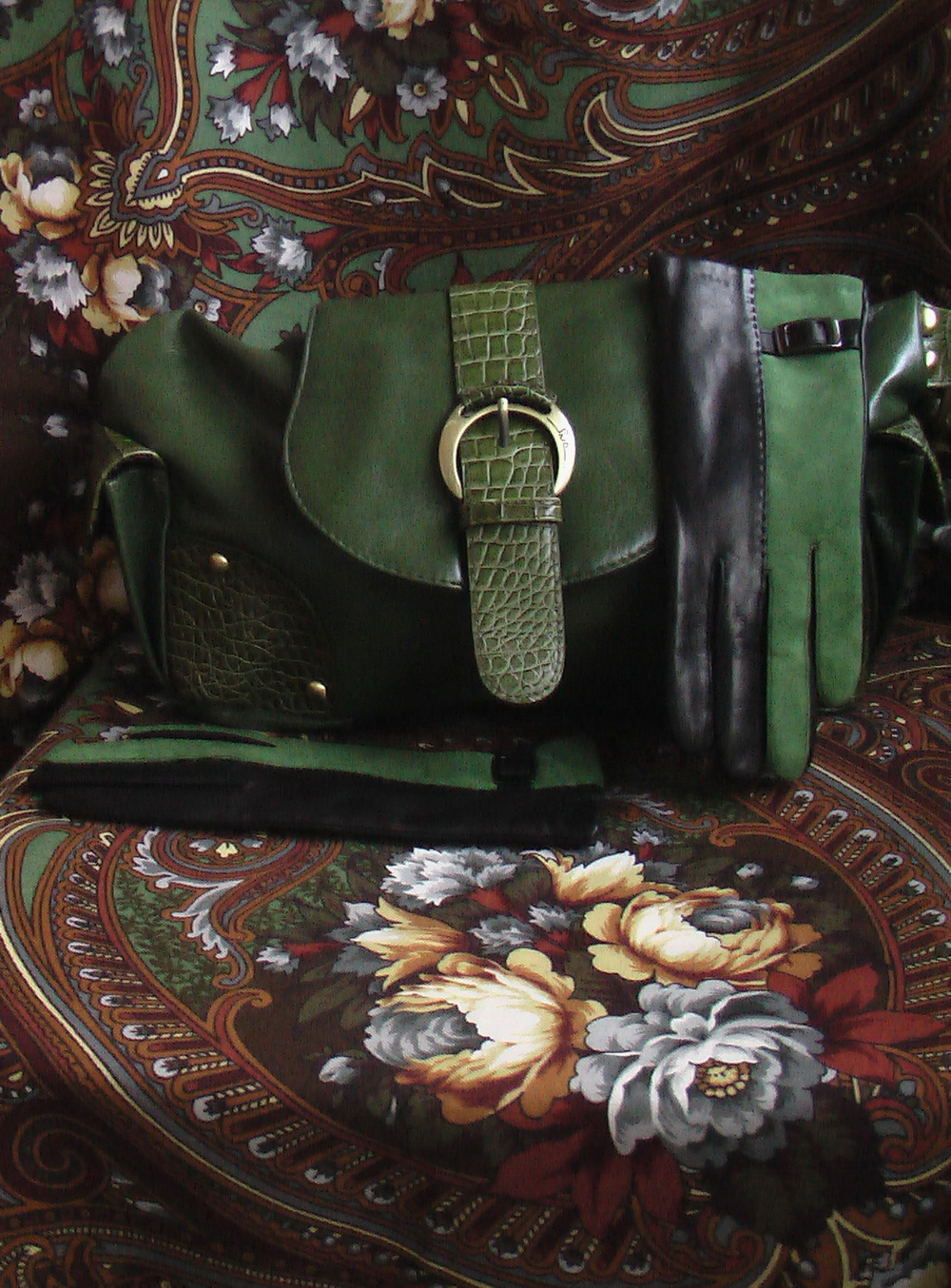 ЗубнаяФея, роскошный комплект ! :: ^% Покажу свои . Я совсем не любитель зелёного, но почему то у меня собрались вот такие комплекты. Сомневаюсь : подходит ли зелёная сумка к перчаткам ( те что чёрные с зелёным на "Сиянии" лежат и "Нежности"). Конечно же было бы идеально если бы сумка была бы из зелёной замши, тем более у меня такие сапоги, но как - то скучно так и я решила купить такую сумку. Что скажите ?