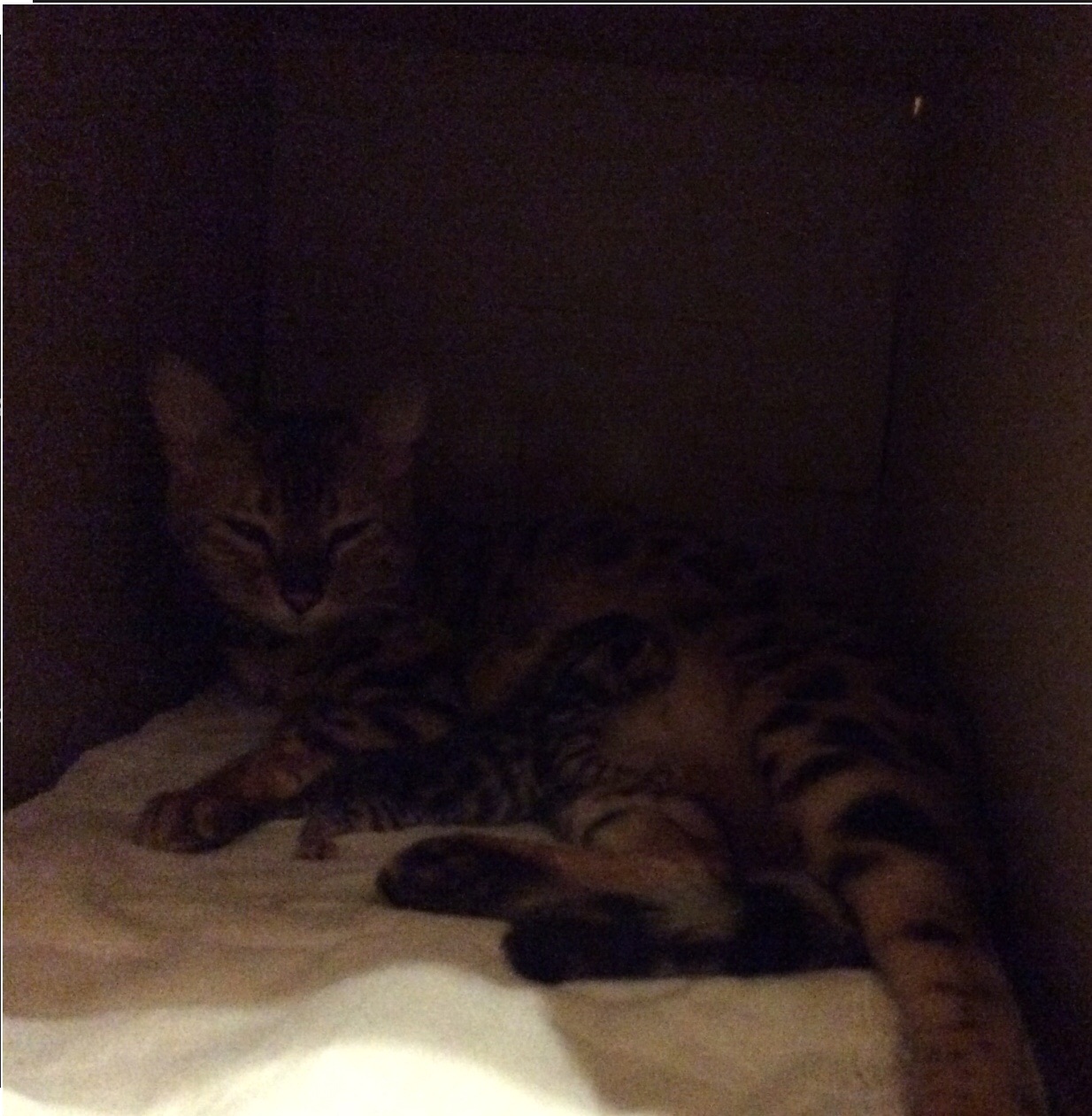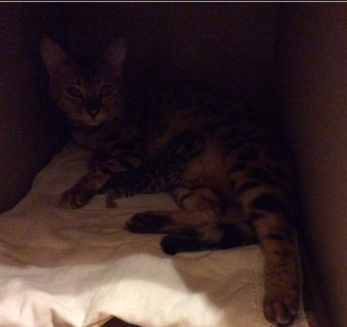 У нас бенгалочка Эва рожает! Пока один. А может только один. Извините за качество фото. Темно в коробке. Но рождение это ведь тайна...