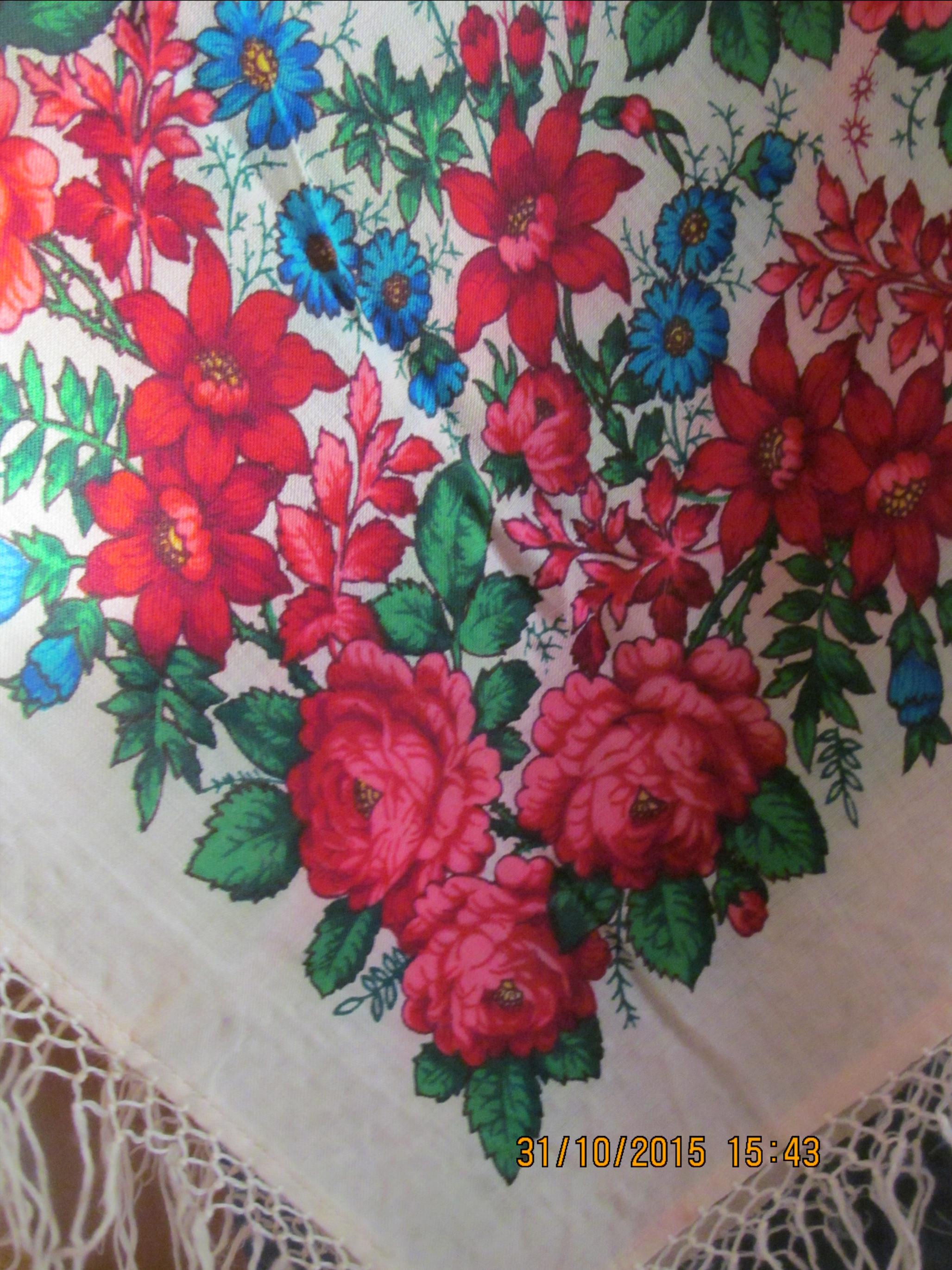 Платок по рисунку вроде наш, измерить забыла, но визуально помню, что не меньше 100-120 см, покупался без бахромы, но с люрексом....где-то на форуме писали, что ППМ выпускала платки с люрексом одно время.