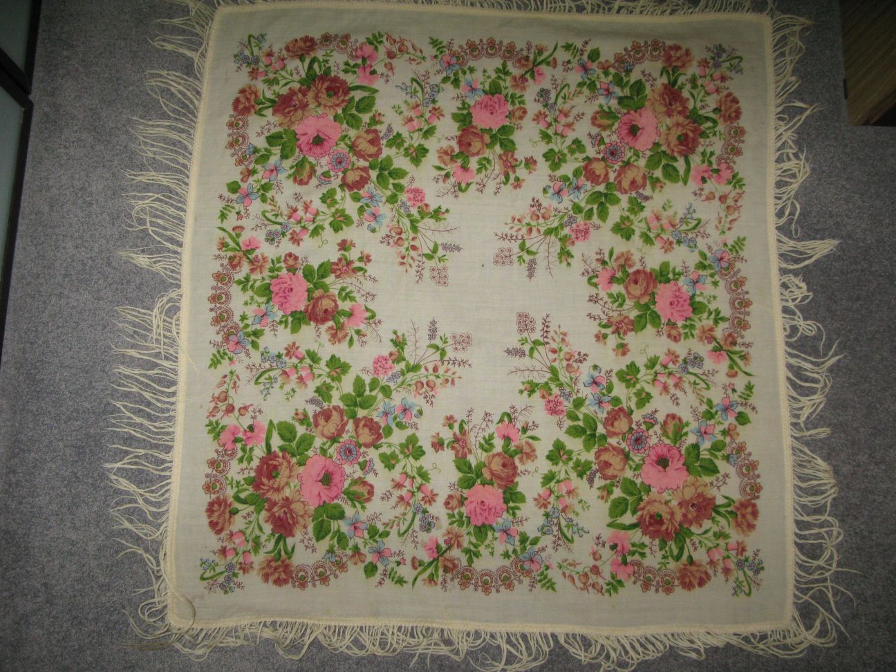 Обнаружился купленный примерно тв 80-е платочек: шерстяной, бахрома шерстяная размер около 89х89, но не очень ровные стороны. Помогите опознать, пожалуйста: