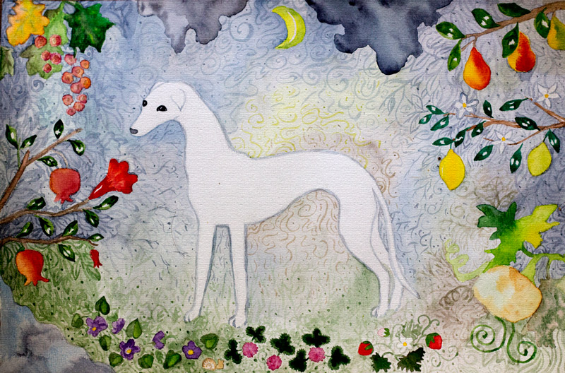 Пыталась нарисовать собаку в стиле старинных гобеленов, и заодно вспомнить, как кисточки и краски использовать. Не скажу, что добилась полного успеха, но удовольствие получила ))