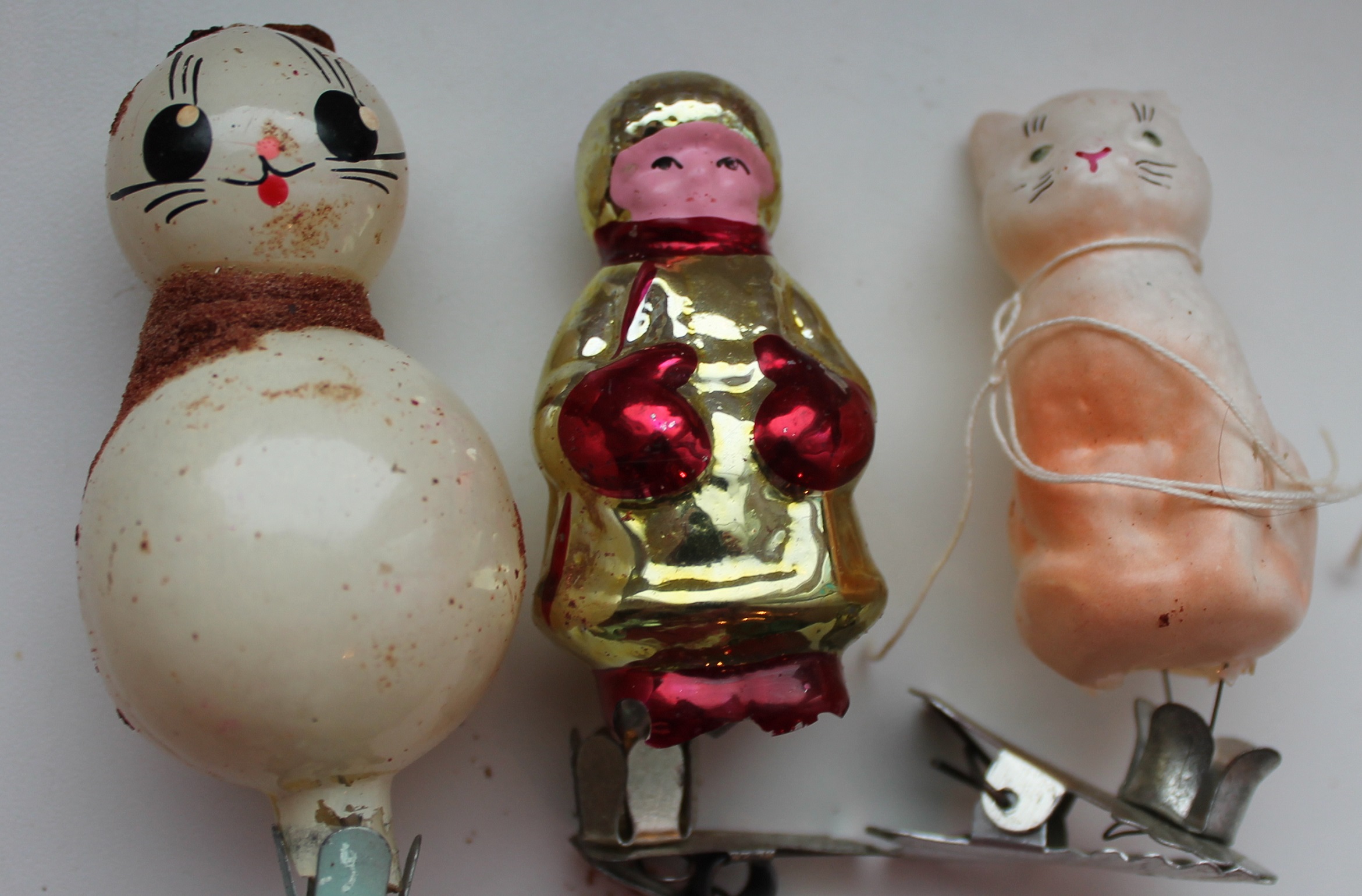 Можно я тоже кое-что поставлю? Редкостей у меня нет, есть просто старенькие игрушки, в основном мои ровесники. Путешествовали с нами, с нашей семьей в коробках, в контейнерах с Севера ни Юг, потом в центральную Россию, потом на Урал, теперь часть из них живет у меня, в Сургуте. К сожалению, живы не все, кое-что побилось, небольшая коробочка пропала при одном из переездов (тогда много чего недосчитались: несколько коробок с книгами, с вещами и вот с елочными игрушками коробочки).