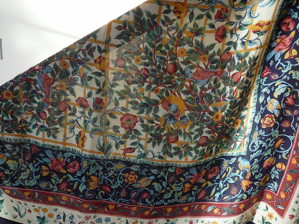 Эту мою шаль-любимицу я называю "Итальянский полдень" Купила ее несколько лет назад во Флоренции. Действительно, вся она как бы дышит Италией и ее фольклором -- солнце, цветущие гранатовые деревья и певчие птицы в их тени... Шаль чистошерстяная, очень тонкая и довольно большая -- почти 140 см сторона. Люблю и берегу ее, хоть и нет на ней никакого дизайнерского имени