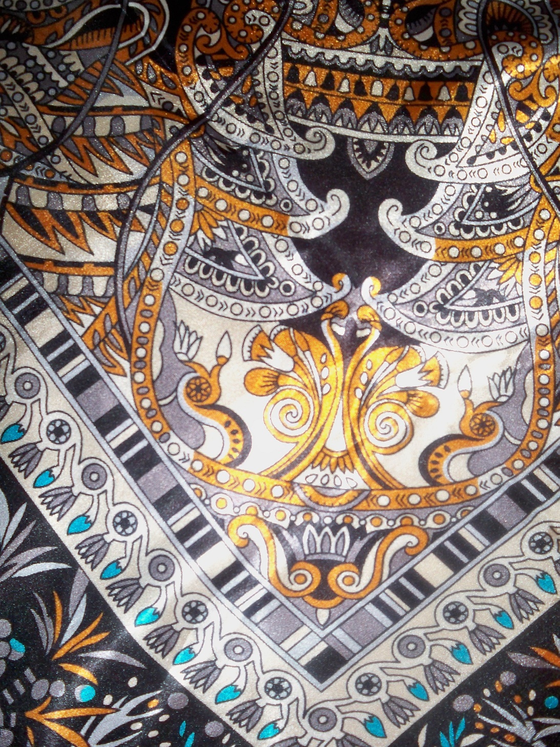 На одном из вещевых рынков нашего города нашла, а потом и купила три атласных платочка из полиэстера, размер 89х89. Рисунок 846-Новелла, в чёрно-серо-белом исполнении. Золото Исиды-два колорита. На вопрос: откуда платочки?, продавец ответила, что из Москвы. Цена одного платка 200 рублей. Этикеток не было, только пришит ярлык с названием материала и знаками по уходу за изделием.