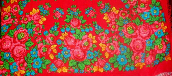 Показываю свои недавно обретенные платочки поподробней. Вначале красный. размер 150*150 вязаная шерстяная бахрома с клеточками. Рисунок традиционный - цветочные букеты. Особенно мне понравились желтые листики на красном фоне и голубые цветочки-колокольчики.
