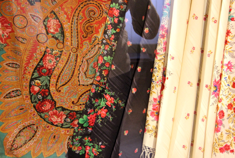 Фотографировать можно (100 рублей). Выставлено в витрине шалей 10. Через стекло неудобно фотографировать.