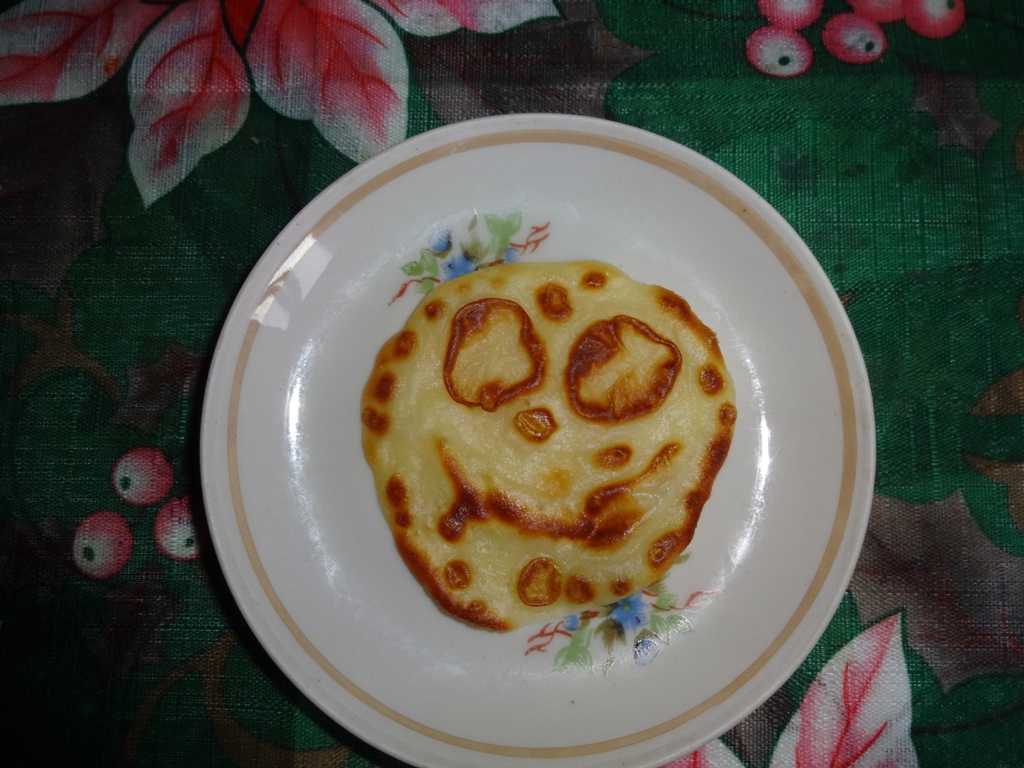 На масленицу пекла блины. Остался маленький комочек теста, решила, что ж пусть будет оладушек. Получился вот такой глазастый монстрик :lol: