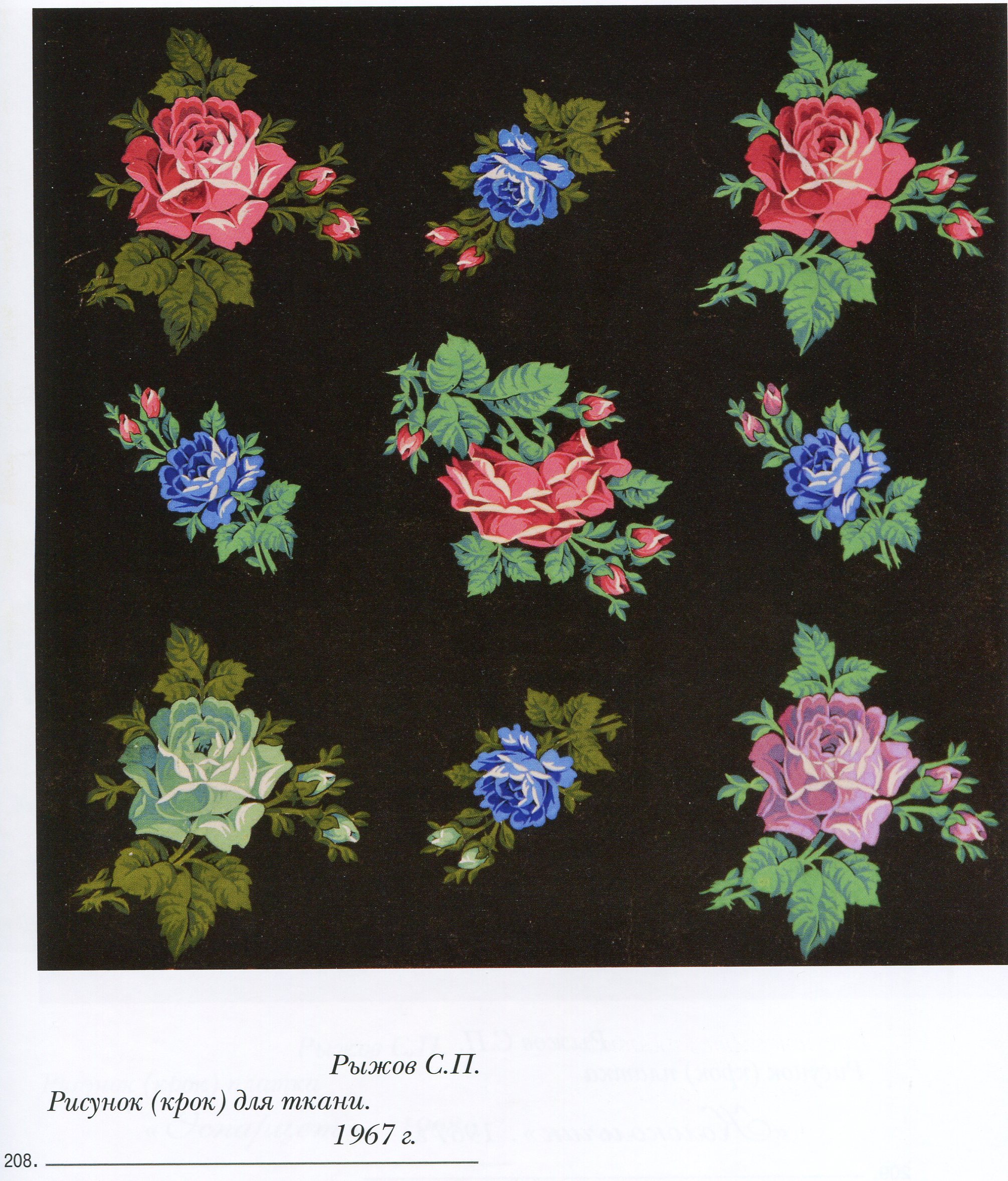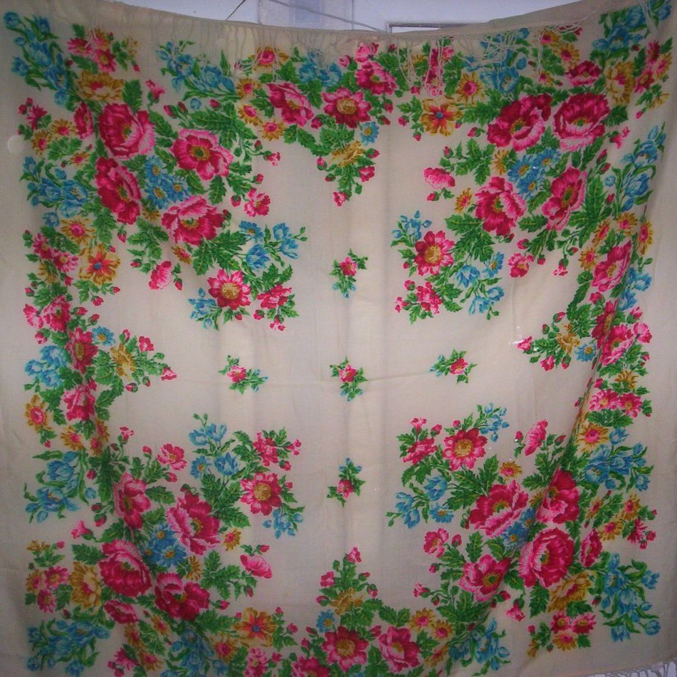 "В 1965 году на фабрике имени Х годовщины Красной Армии способом фотофильмпечати выпускали платок Рыжова "Четыре праздника": черный грунт, четыре угла, в каждом разные цветы - маки, георгины, розы и сирень" ( А. Коновалов. Плат узорный. М. 1981, с.104).