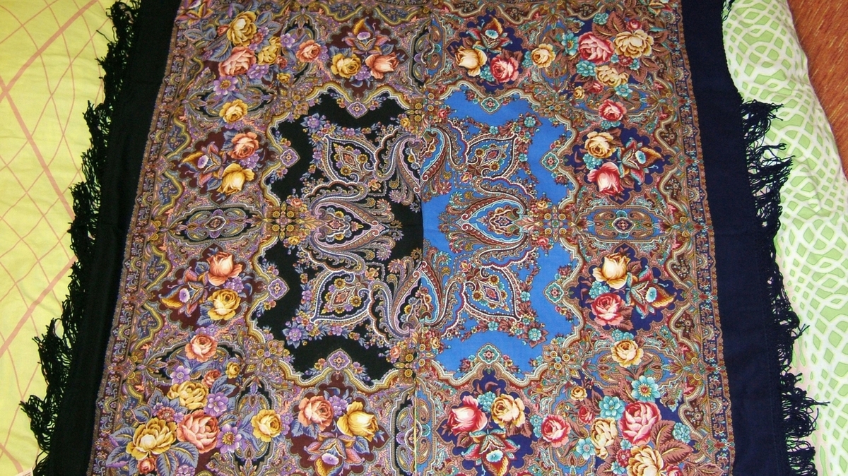 По-моему, мандрагора не цветет? Но рисунок на шалях\платках,ведь, немножко сказка? Аллегория? Абстракция...И мне показалось, подумалось, что под розовой и чайной розочками, головкой к краю каймы, девятилепестковый, с голубенькой серединкой (см. нижнее фото - там крупнее) - это он и есть!