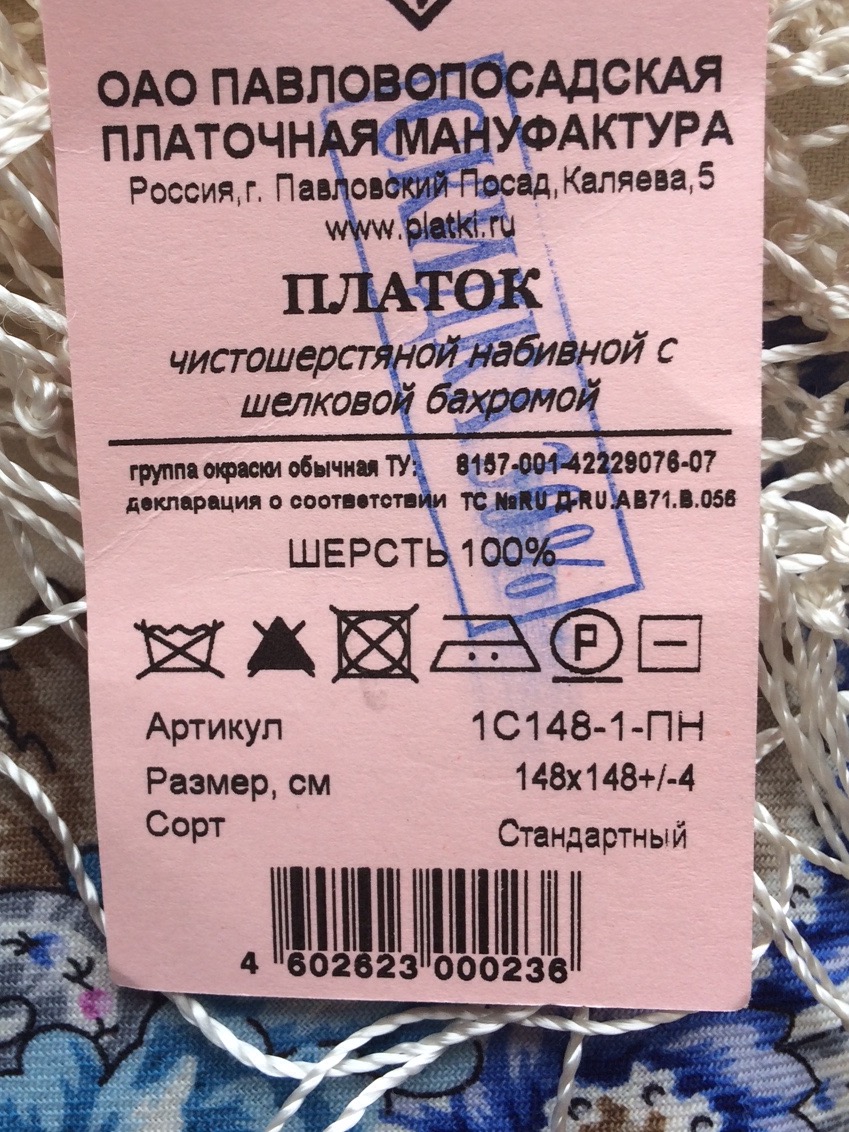 А вот этикетка шали 3-го сорта, купленной в отделе лоскута магазина Павловского Посада.