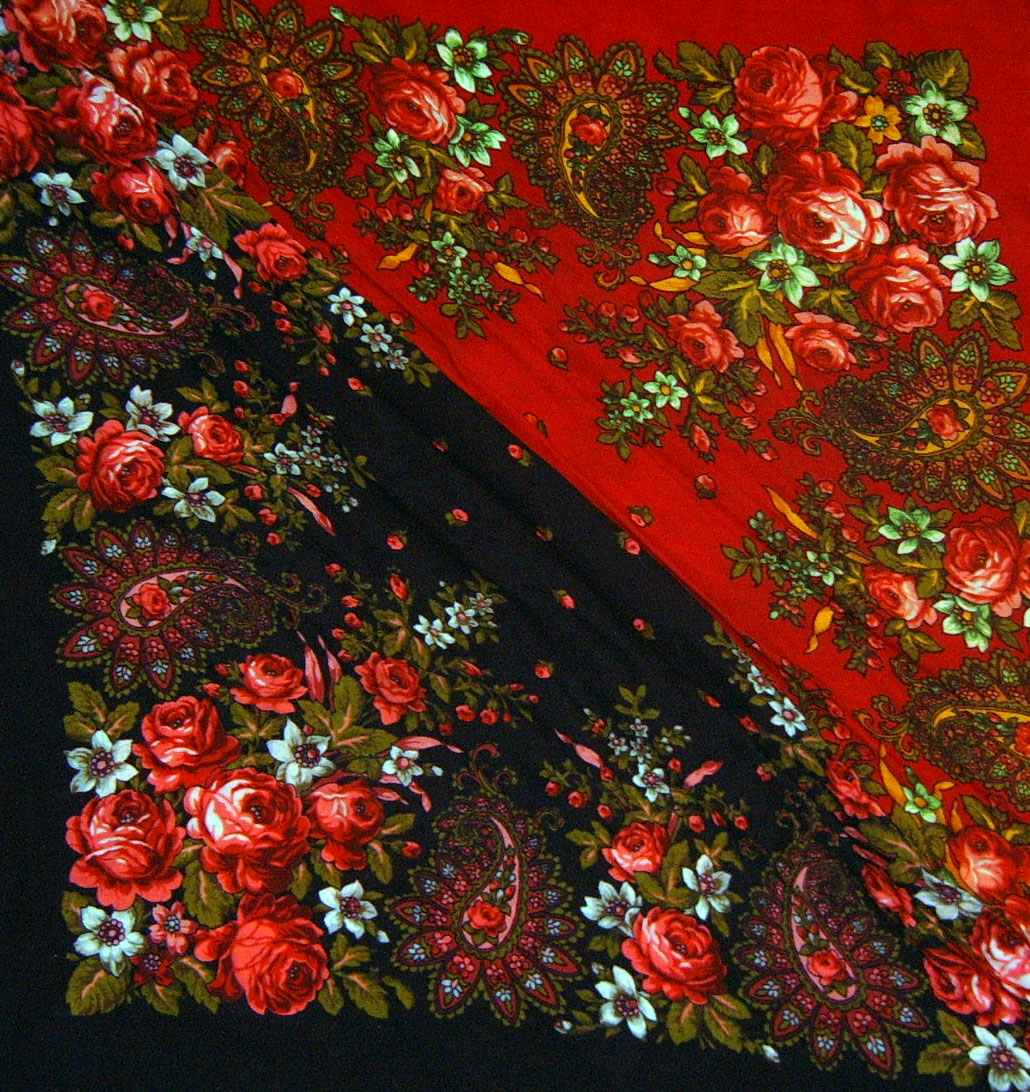 Шаль 146х146 с букетами тюльпанов и ягодами малины по кайме_Экспертиза 15.11.15