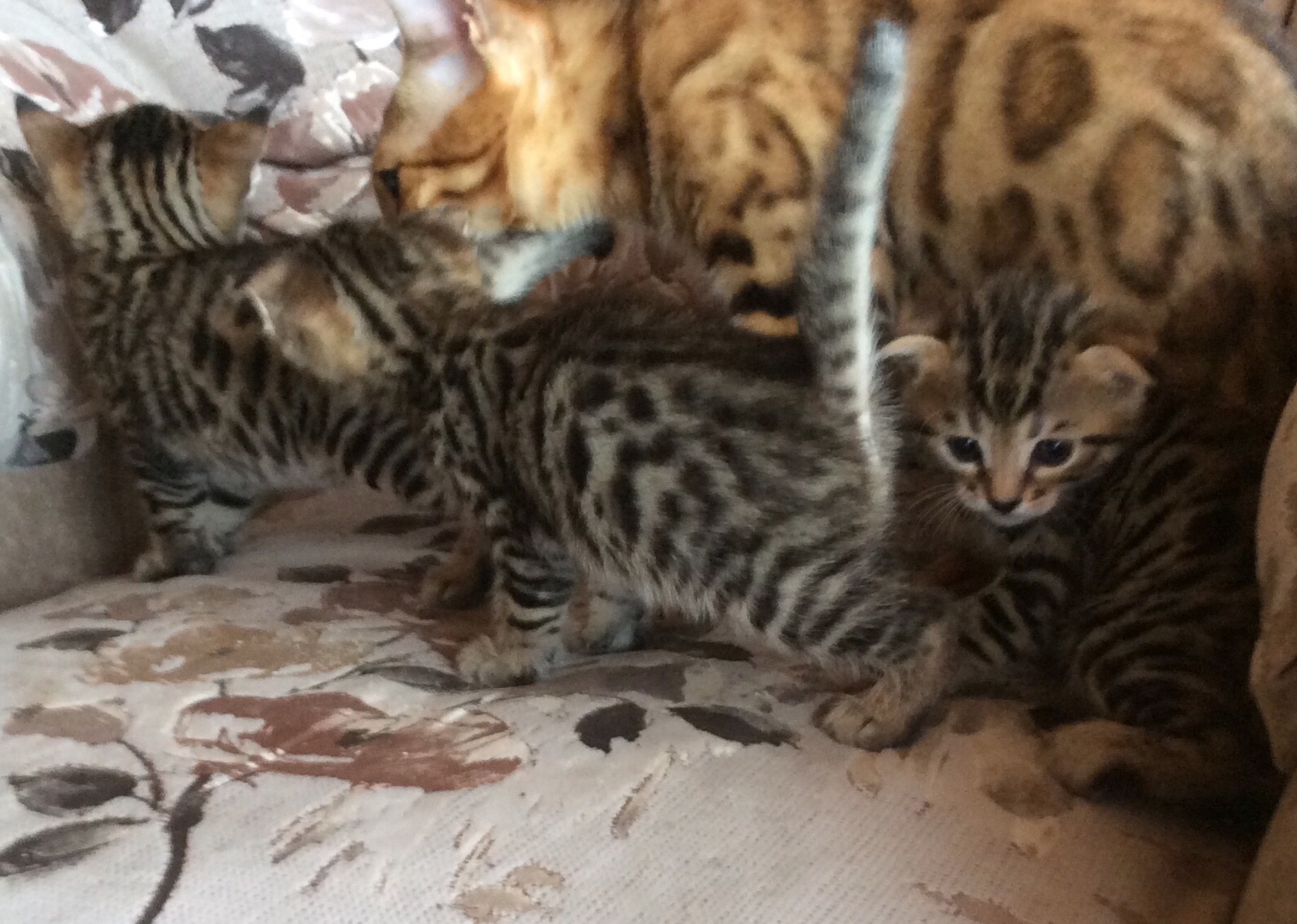 Вообще, Бенгалы - это что-то... Все трое ходят за мной по пятам, как собаки. Где останавливаюсь, они тут же занимают места рядом. А сегодня в гостях был семилетний мальчик, зашел посмотреть на котят, сел в кресло со мной, котят не трогал. Но мамаша! Глаз с него не сводила, беспокоилась. Я пару раз пыталась ее успокоить поглаживанием, но в ответ она прикусывала мне руку, давая понять, что непорядок приводить чужих к ее котятам. Вот как.