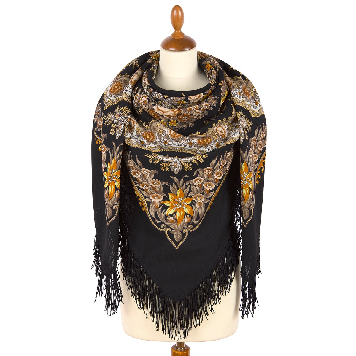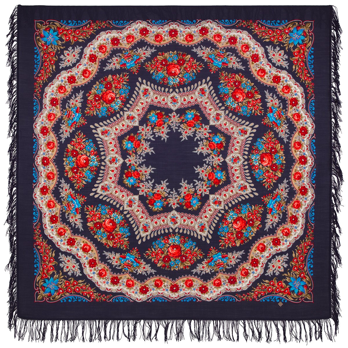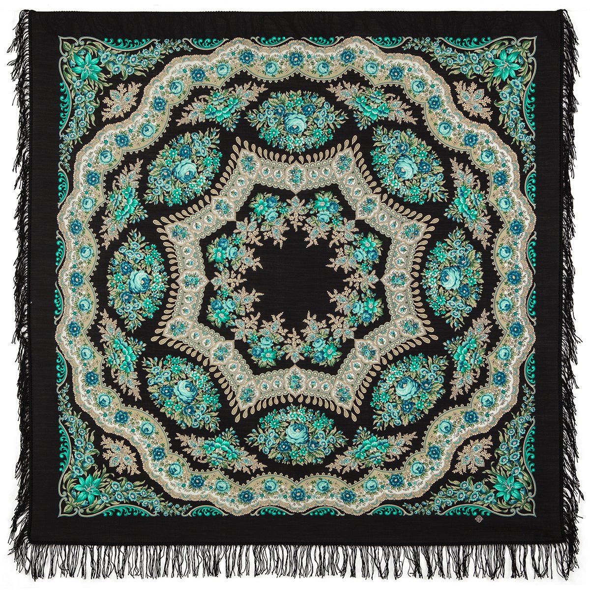 Шаль 150х150 с крупными букетами по углам и ажурным веночком из листьев каштана в среднике