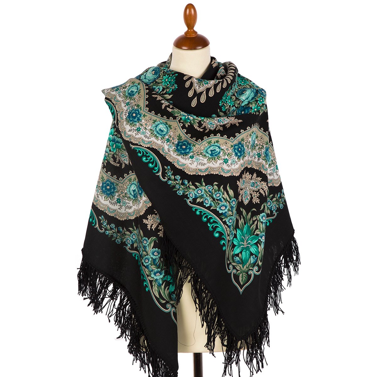 Шаль 150х150 с крупными букетами по углам и ажурным веночком из листьев каштана в среднике