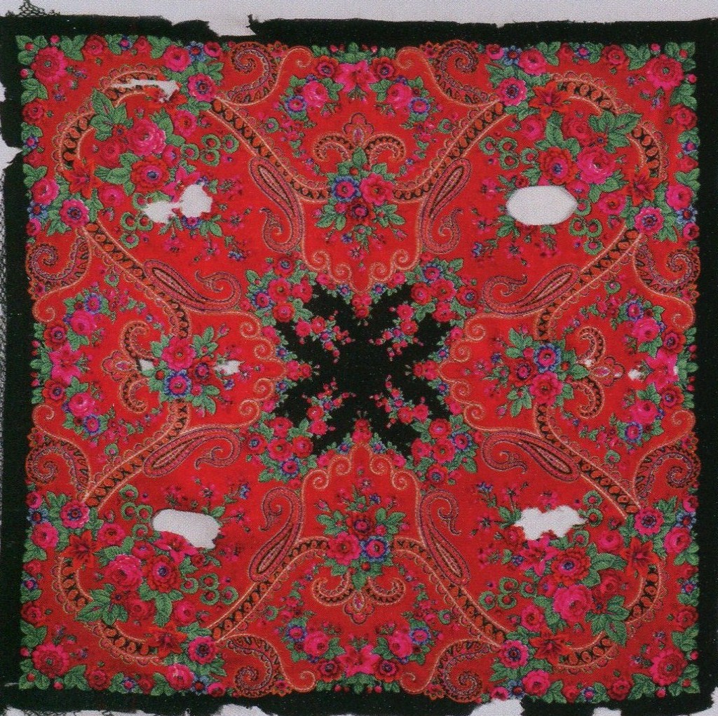 Квадратной формы. Основу составляет шелковая ткань зеленого цвета. По периметру расположен широкий бордюр растительного орнамента, выполненный в технике набойки многоцветными красками. Края платка обвязаны кистями.