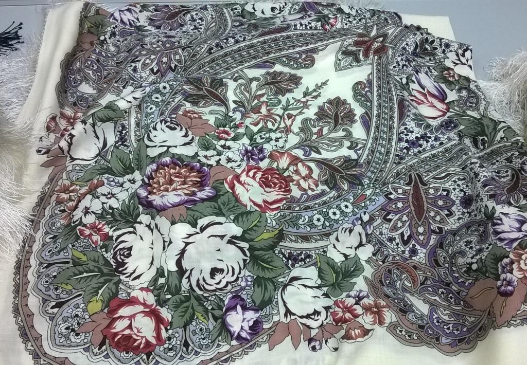 Добрый вечер всем. Я на форуме новенькая,но свою небольшую коллекцию шалей и платочков имею. Хочу сделать свой вклад в эту тему.Недавно приобрела непрокрашенную шаль Миндаль 0. Показалась мне очень интересной. Белопольная р-р 150х150. Цветов всего три-коричневый, красный и на краях листочков немного хаки. Издалека рисунок кажется серым, но на самом деле это просто черный контур, как бы нарисованный тонкой гелевой ручкой. Рисунок четкий, я бы сказала-чеканный. Ткань плотная, пластичная.