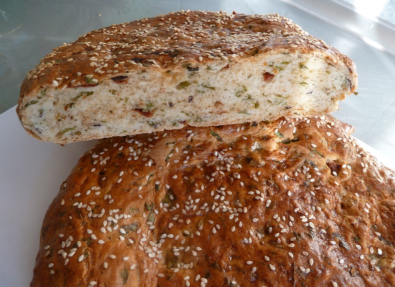 Дрожжи растворить в теплой воде, добавить сахар, соль, растительное масло, мелко нарезанную зелень, помидоры (можно оливки). Все хорошо перемешать. Затем добавить муку, вымесить тесто. Поставить в теплое место для подъёма. Кода тесто подойдёт, разделить на две части и сформировать лепешки. Противень застелить пекарской бумагой, смазать маслом, выложить лепешки, серединку наколоть вилкой и оставить для расстойки на 30-40 минут. Перед выпечкой смазать поверхность лепешек взбитым яйцом, посыпать кунжутом.