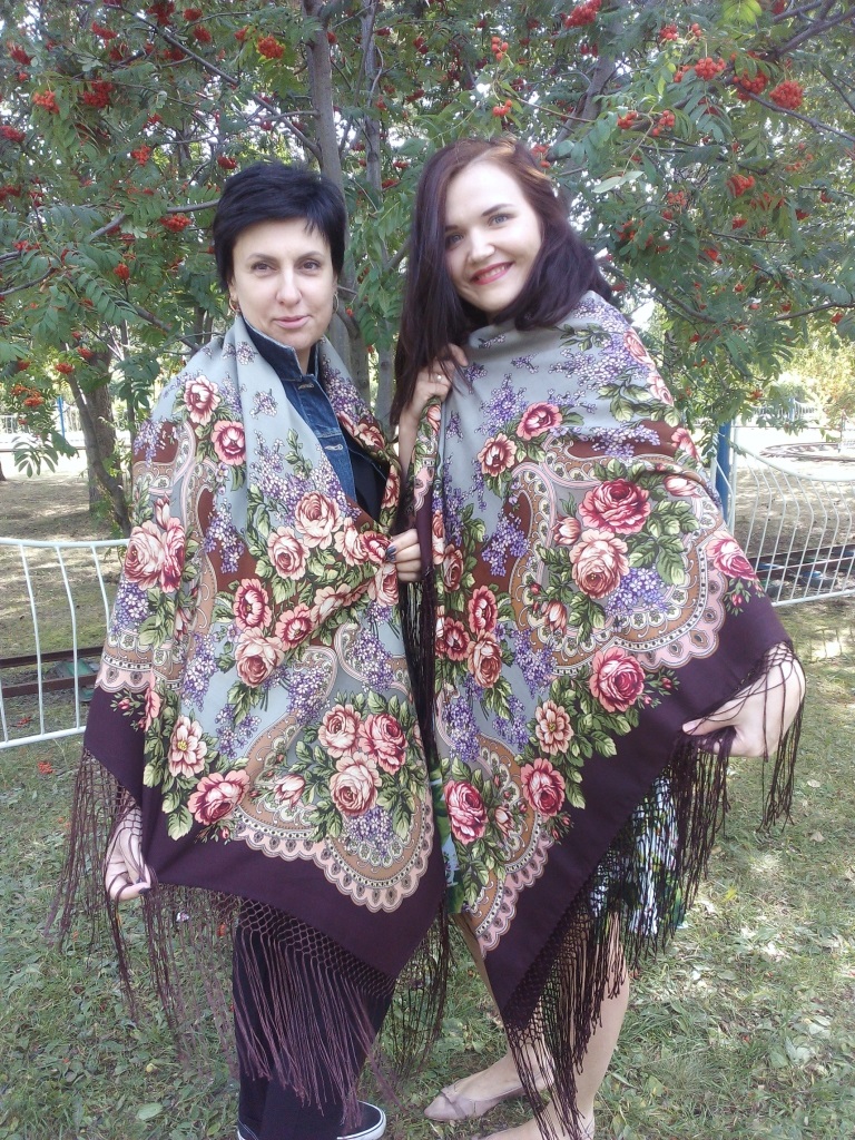 Палантин с гибискусами у Маши. Вполне себе городской палантин. С джинсовкой смотрится отлично.