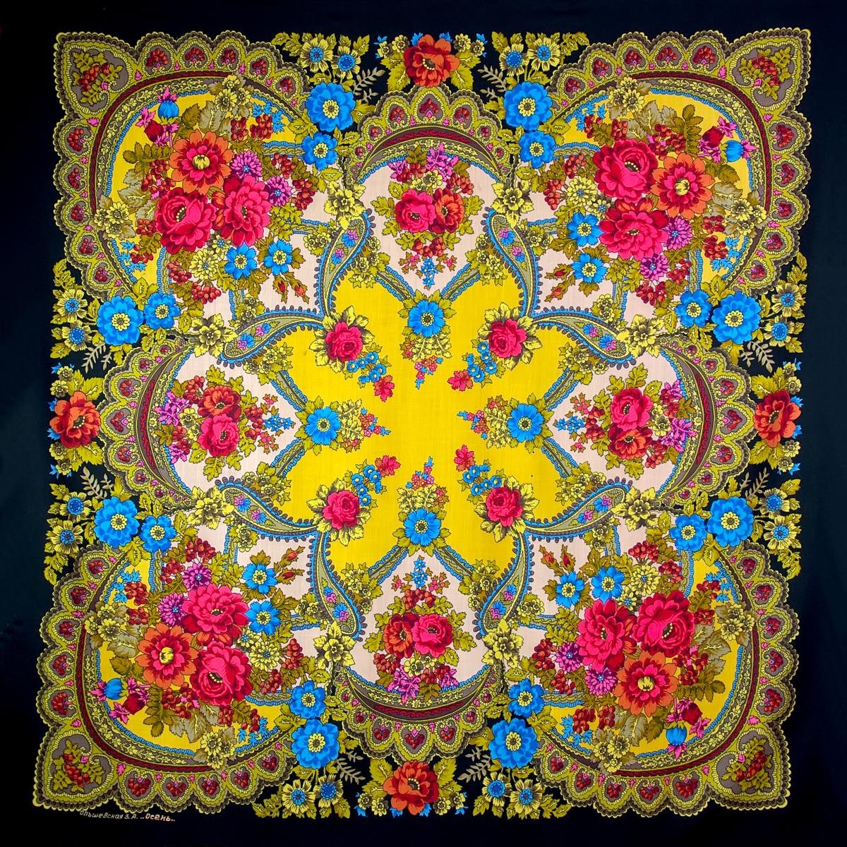 Мануфактуре понравилась идея художницы, и ее попросили нарисовать крок шали «Времена года. Осень» и запустили его в производство. Напечатали много разных колоритов этой шали и сейчас они широко известны среди коллекционеров.