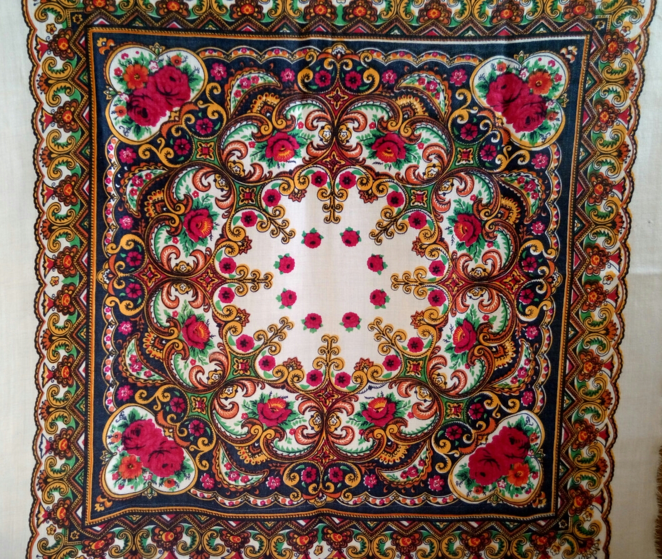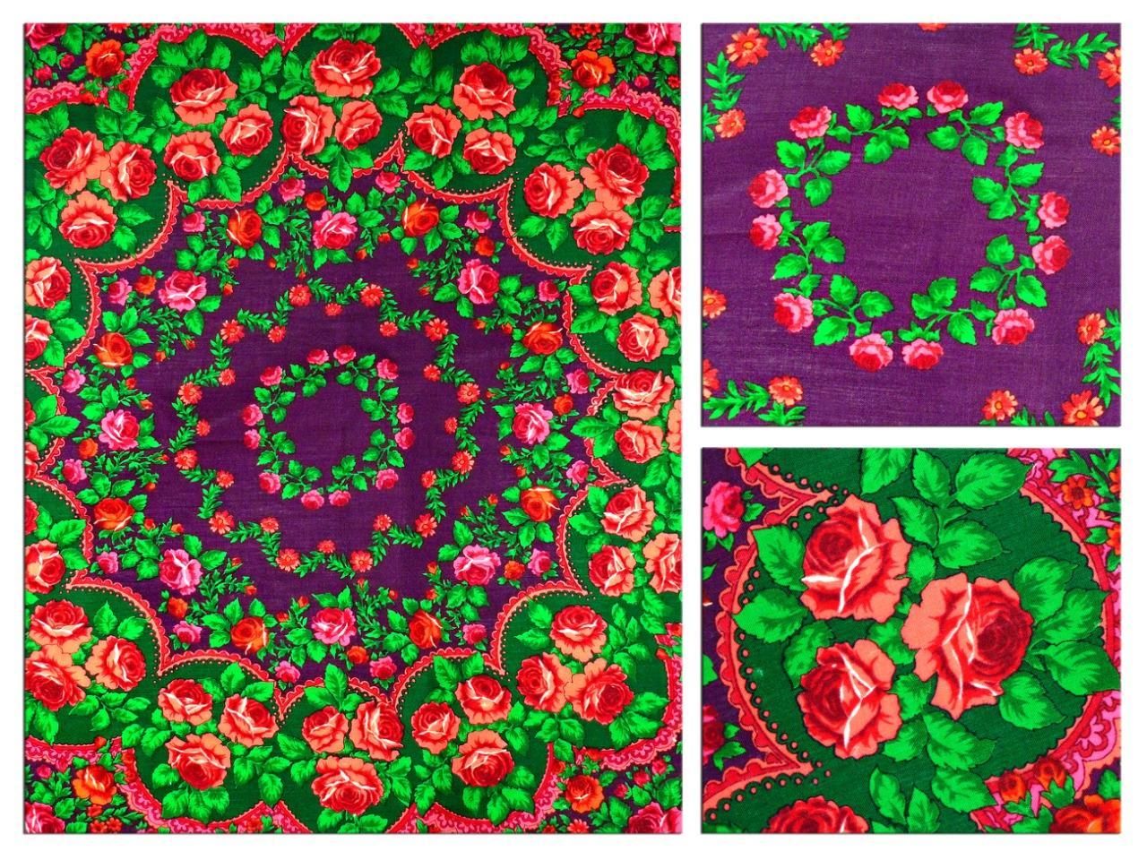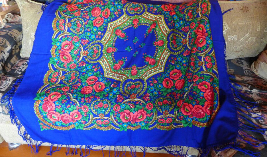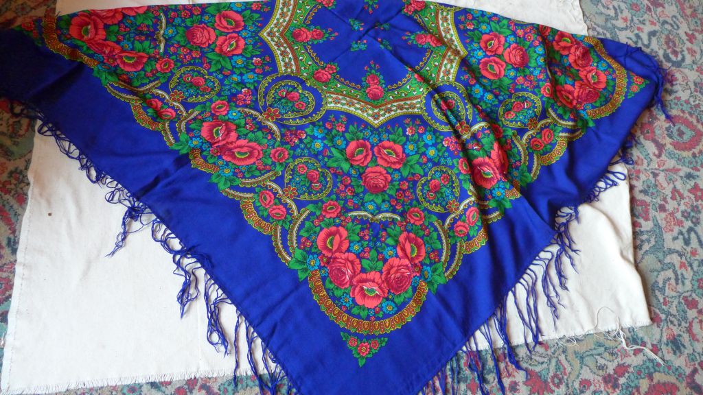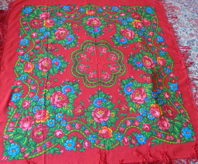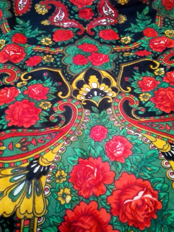 Хочу показать и я свое последнее приобретение. Я платки в последнее время практически не покупаю, но в эту шаль влюбилась с первого взгляда, бегала на нее смотреть и в конце концов купила, не удержалась. Шаль туркменская, есть даже надпись - обожаю вязь, загадочные буквы, теперь у меня и шаль и кольцо есть с восточными надписями вязью. Но художник, мне кажется, павлопосадский и у меня даже есть подозрение на одного, но пока не буду высказывать, подожду, может быть, понимающий народ выскажется. Характер шали - сдержанный, элегантный, немного торжественный и я, бы сказала, концертный. Уже вторая у меня туркменская сдержанная красотка. Набойка ручная, на мой глаз. Прошу любить и жаловать.