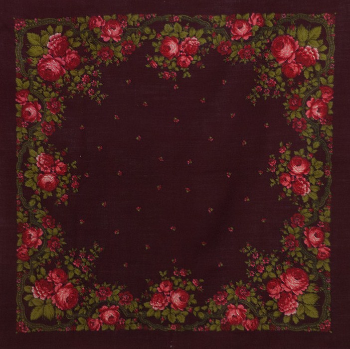 Платок шерстяной 82х82 с цветочным мотивом с розами, украшенным узкой декоративной лентой по кайме