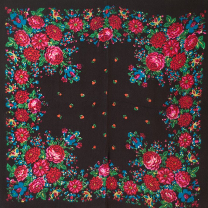 Платок шерстяной 74х74 с гирляндой из мелких цветочков по кайме с вплетёнными в неё букетами