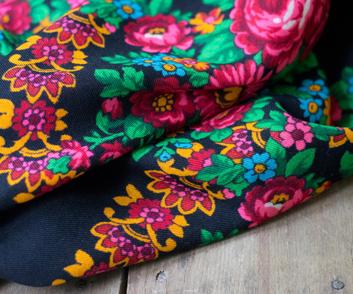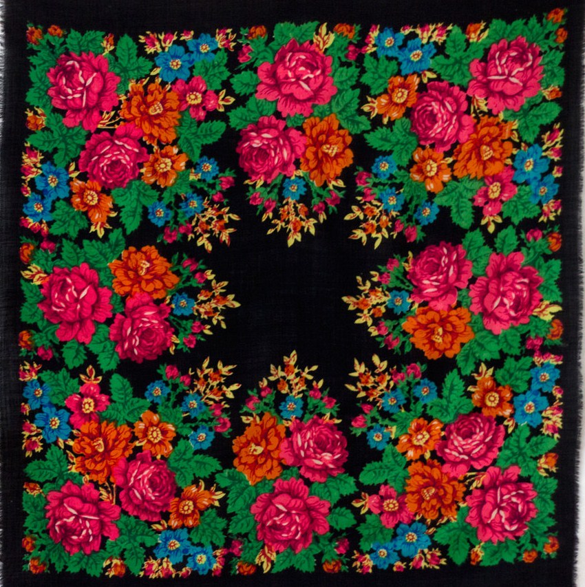 Платок шерстяной 96х96 с розами и гибискусом в пышных букетах