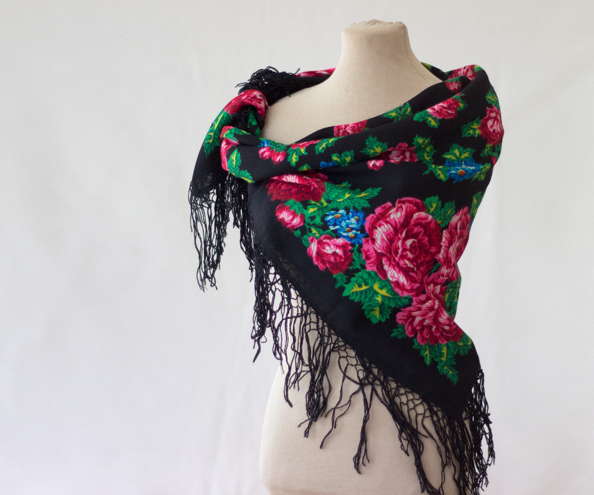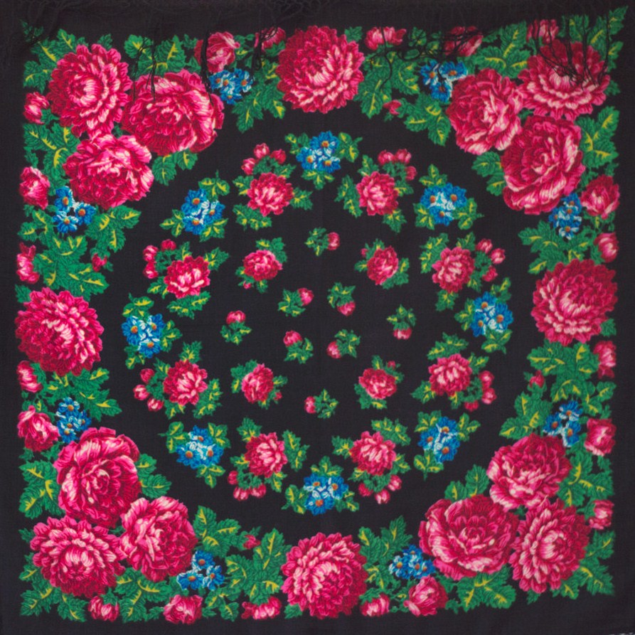 Платок шерстяной 82х82 с цветочным мотивом с розами, украшенным узкой декоративной лентой по кайме