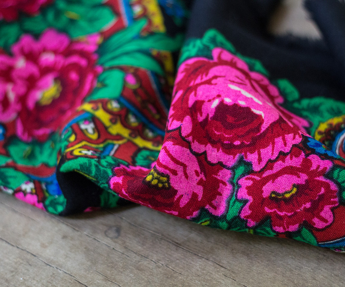 А вот для малинового я сделаю отдельную полочку. На мой беглый взгляд, платочек может быть из Павловского Посада. Сделайте, пожалуйста, фотографии фрагментов. Заметила в орнаменте несвойственный ППМ элемент... Тоже может быть из Баку, как и чернопольный.