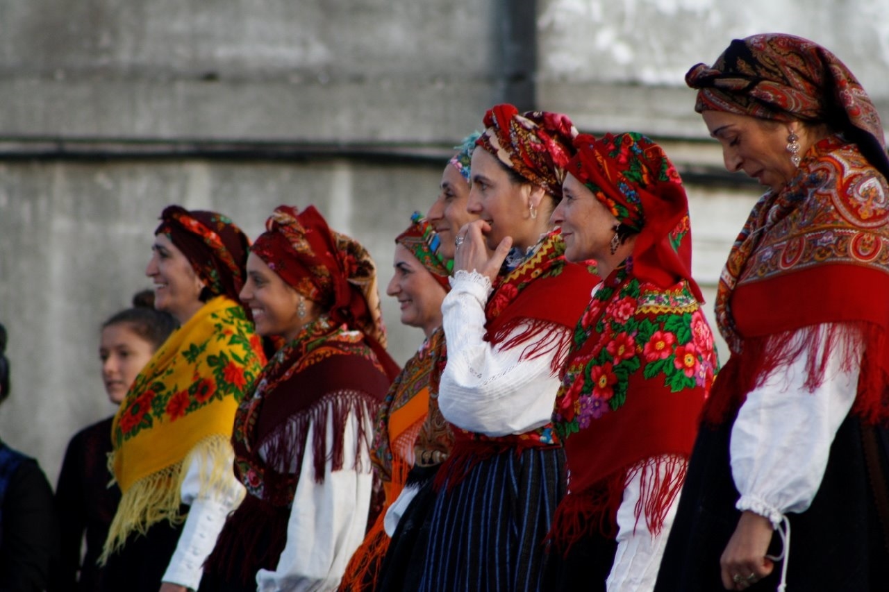 Нашла сайт провинциального галисийского ансамбля "Antaruxas и Sorteiros". Группу эту, входящую в культурную ассоциацию с тем же названием, создали в 1979 году жители Фонсаграды (муниципалитет в провинции Луго с населением чуть больше 4 тыс.) с целью изучения и сохранения истории региона через музыку и танец. Используют костюмы и инструменты, характерные для региона, участвуют во множестве фестивалей и конкурсов в Испании и за рубежом. Из фотоотчетов с мероприятий видно, что в 2009 году костюмы были совсем другие, преобладал черный цвет, цветастых шалей не было и в помине (фото 1, 2).