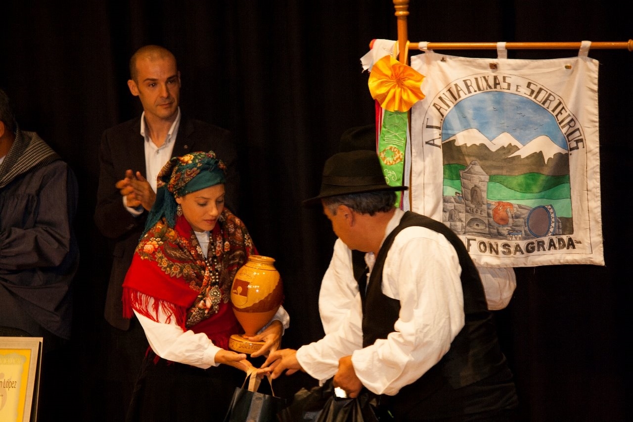 Нашла сайт провинциального галисийского ансамбля "Antaruxas и Sorteiros". Группу эту, входящую в культурную ассоциацию с тем же названием, создали в 1979 году жители Фонсаграды (муниципалитет в провинции Луго с населением чуть больше 4 тыс.) с целью изучения и сохранения истории региона через музыку и танец. Используют костюмы и инструменты, характерные для региона, участвуют во множестве фестивалей и конкурсов в Испании и за рубежом. Из фотоотчетов с мероприятий видно, что в 2009 году костюмы были совсем другие, преобладал черный цвет, цветастых шалей не было и в помине (фото 1, 2).