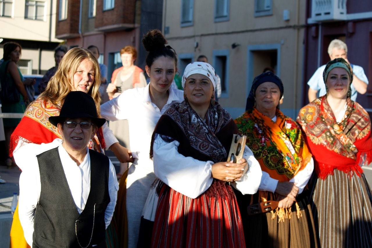 Нашла сайт провинциального галисийского ансамбля "Antaruxas и Sorteiros". Группу эту, входящую в культурную ассоциацию с тем же названием, создали в 1979 году жители Фонсаграды (муниципалитет в провинции Луго с населением чуть больше 4 тыс.) с целью изучения и сохранения истории региона через музыку и танец. Используют костюмы и инструменты, характерные для региона, участвуют во множестве фестивалей и конкурсов в Испании и за рубежом. Из фотоотчетов с мероприятий видно, что в 2009 году костюмы были совсем другие, преобладал черный цвет, цветастых шалей не было и в помине (фото 1, 2).