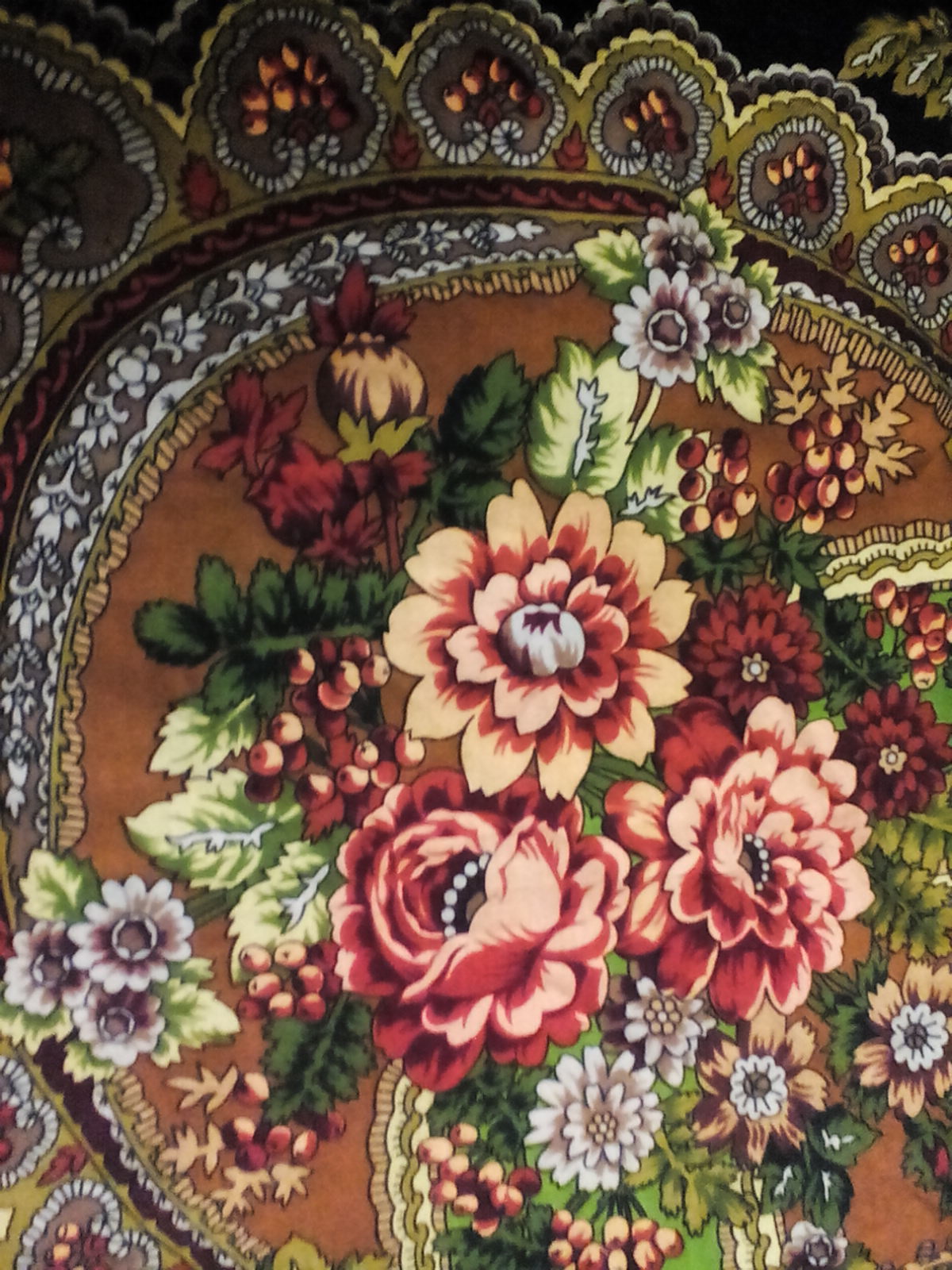 Здравствуйте, дорогие форумчанки, у моей бабушки есть очень старый платок, наверное 1920 года выпуска. Помогите, пожалуйста определить, что это за платок, может быть известен автор. Платок совсем старенький, его много носили. Фон у него темной морской волны.