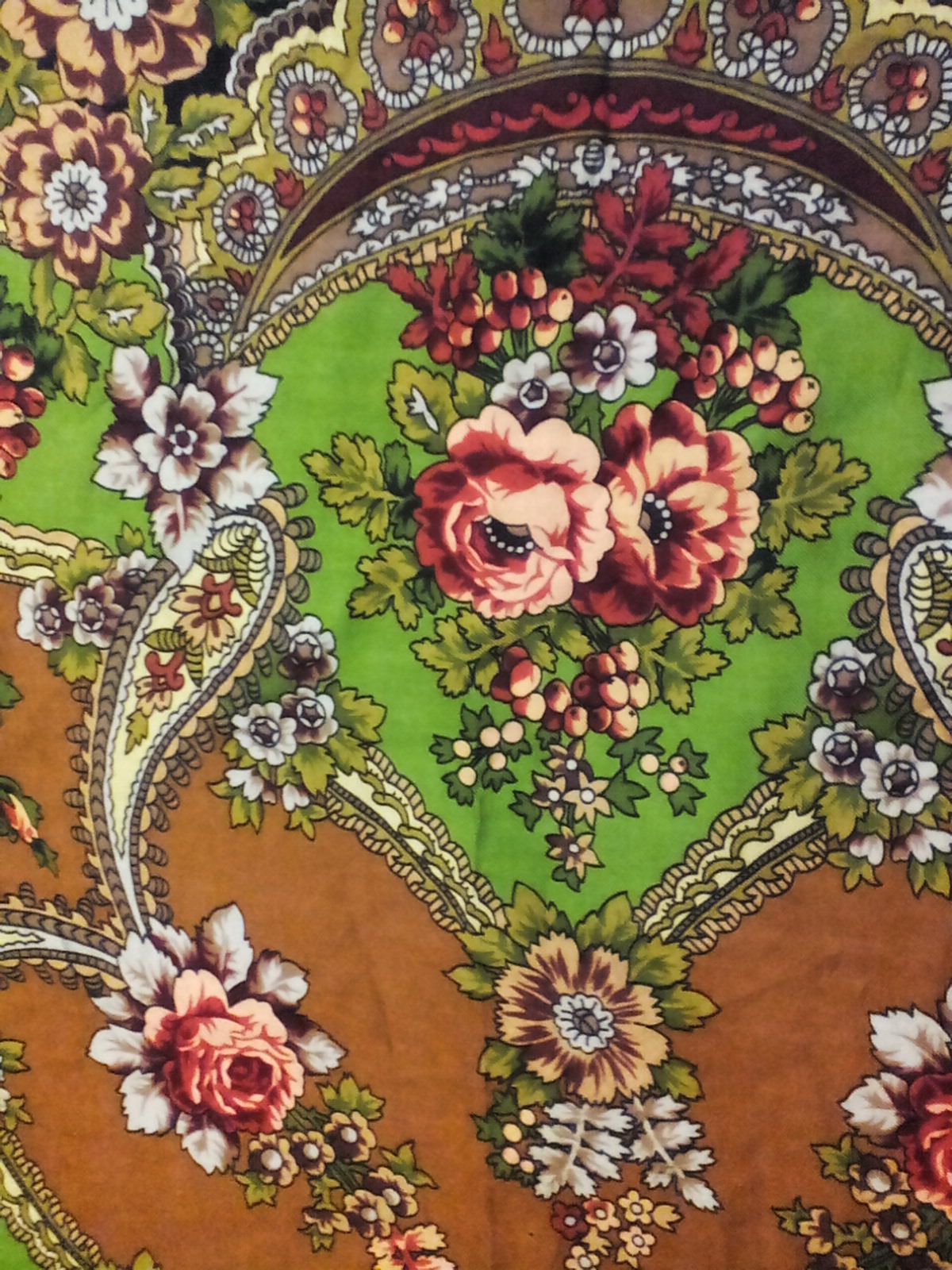 Здравствуйте, дорогие форумчанки, у моей бабушки есть очень старый платок, наверное 1920 года выпуска. Помогите, пожалуйста определить, что это за платок, может быть известен автор. Платок совсем старенький, его много носили. Фон у него темной морской волны.
