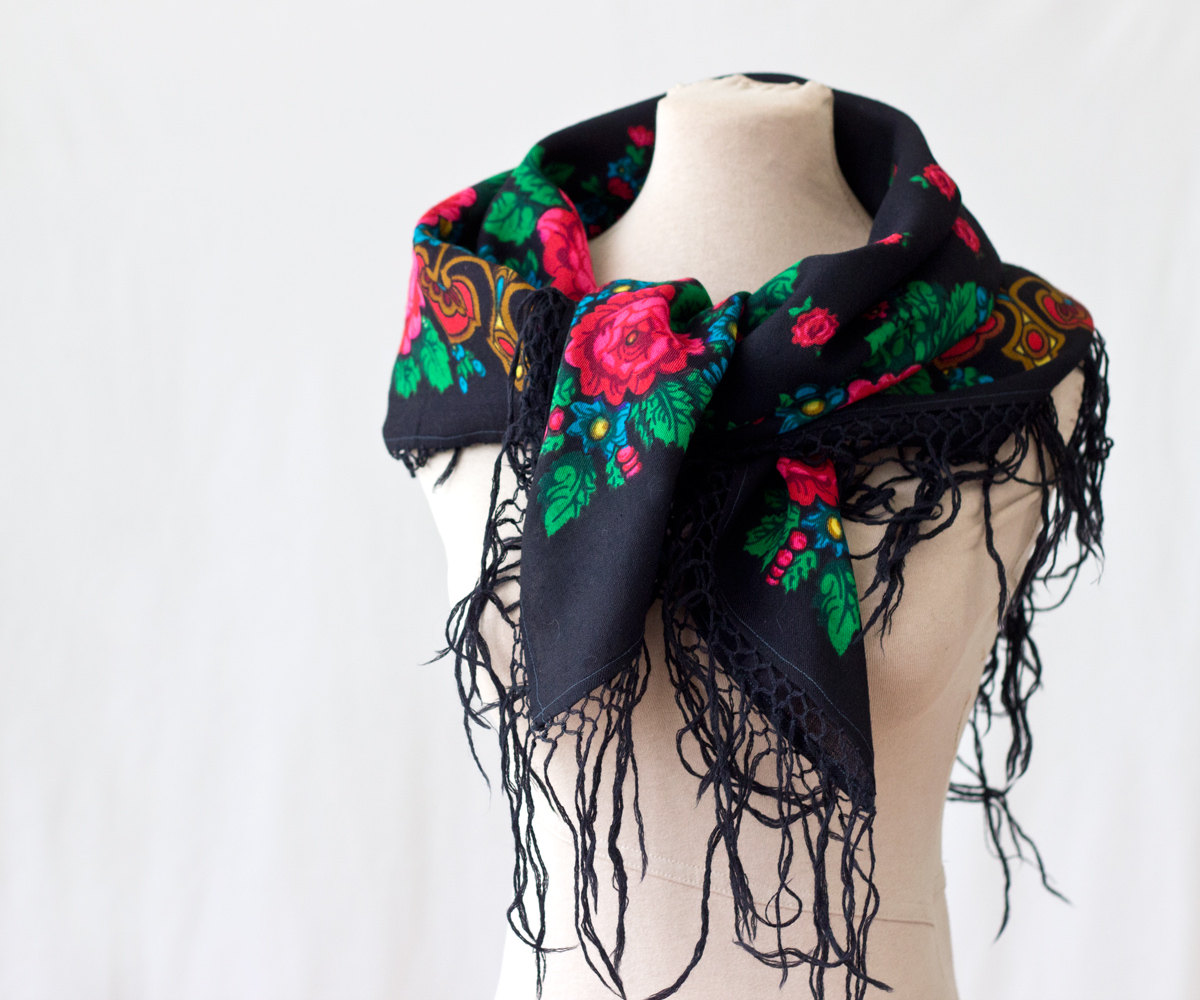 Платок шерстяной 96х96 с букетами роз, бусами и резным цветным орнаментом