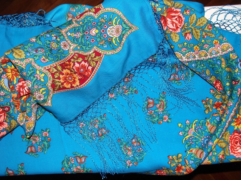 "Медальоны". Бахрома очень окрашивает руки. Правда. Когда стало жарко сняла шаль и держала в руках... долго удивлялась почему часть руки голубая(там, где бахрома была). Нитки на бахроме сильно раскручиваются, лохматятся. Я уже подумывала вообще их сбрызнуть лаком-спреем, чем-нибудь, что фиксирует, вплоть до прозрачного лака для ногтей(капельку, на узелок)....