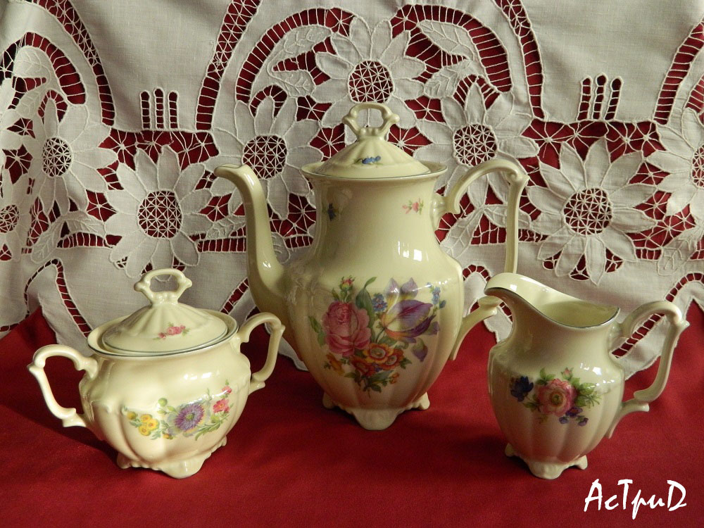 AcTpuD, очень красивые оба ::P ! А на пастельном и цветы-букеты разные, такие нежные и милые, очень гармоничный сервиз. Если это наследство, то посуда несовременная? Из какого примерно времени и откуда? На донышках клейма есть... И очень красивый подзор, изумительная работа :: Спасибо, что показали такую красоту ^%