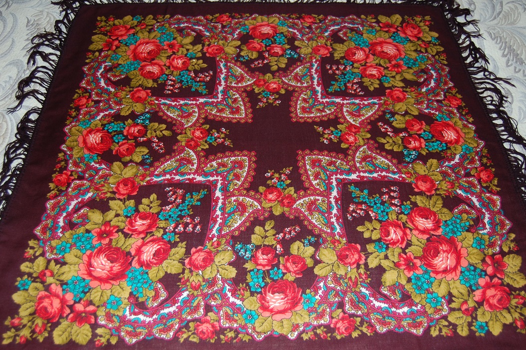 Платок маленький - стороной 88 см, даже не 89 см. На нём никаких опознавательных знаков. Этикетку я помню, была обычная белая, бумажная, вшитая в кайму оверлоком. На ней было написано, что это Павловопосадская фабрика. Ему лет столько, сколько мне, и куплен мамой для меня, и куплен он году в 1978 примерно. Может, и позже, но не позднее 1979 года. Был очень дорогим, несмотря на маленькие размеры. Когда я доросла до него, а было это, когда мне стукнуло 16 лет, то на второй же день я прожгла его на кухне: от спички отлетела искра. На платке видны крошечные ожоги, размером с пылинку. Мама рассердилась и отняла его и спрятала туда, где он лежал шестнадцать лет. Затем, года в 23, опять я до него добралась, и тут мама была бессильна: я его закалывала при помощи янтарной брошки. От этого тоже остались три крошечные дырочки. Вот если бы не это, можно было бы сказать, что платок выглядит, как новый. При своей яркости цвета спокойные. И всего пять красок на нем. А эффект... Я убеждена, что он кисти Слащёвой. Я его сама для себя называю "Мини-Финифть". Не сочтите за самоуверенность, а вглядитесь в эти розы...