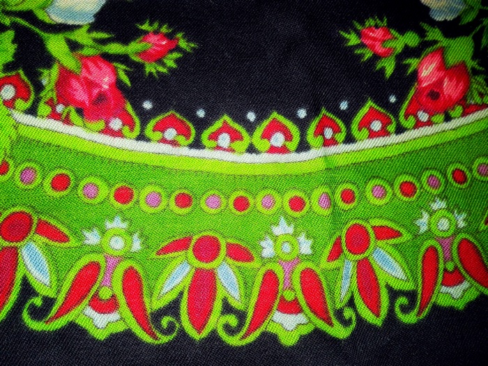 Платок маленький - стороной 88 см, даже не 89 см. На нём никаких опознавательных знаков. Этикетку я помню, была обычная белая, бумажная, вшитая в кайму оверлоком. На ней было написано, что это Павловопосадская фабрика. Ему лет столько, сколько мне, и куплен мамой для меня, и куплен он году в 1978 примерно. Может, и позже, но не позднее 1979 года. Был очень дорогим, несмотря на маленькие размеры. Когда я доросла до него, а было это, когда мне стукнуло 16 лет, то на второй же день я прожгла его на кухне: от спички отлетела искра. На платке видны крошечные ожоги, размером с пылинку. Мама рассердилась и отняла его и спрятала туда, где он лежал шестнадцать лет. Затем, года в 23, опять я до него добралась, и тут мама была бессильна: я его закалывала при помощи янтарной брошки. От этого тоже остались три крошечные дырочки. Вот если бы не это, можно было бы сказать, что платок выглядит, как новый. При своей яркости цвета спокойные. И всего пять красок на нем. А эффект... Я убеждена, что он кисти Слащёвой. Я его сама для себя называю "Мини-Финифть". Не сочтите за самоуверенность, а вглядитесь в эти розы...