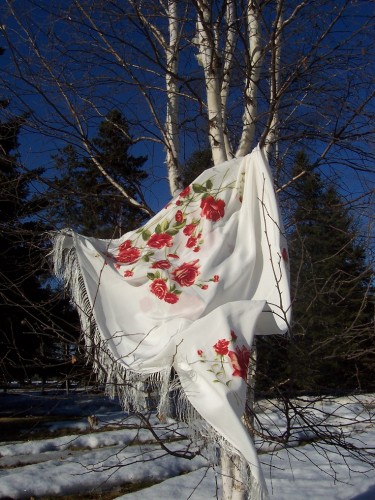 Во-первых, вопрос к блондинкам. Посоветуйте платок. У подруги скоро день рождения, хочу подарить. Это первый у неё будет. Она очень светлая блондинка с ярко-голубыми глазами. Какие платки идут таким женщинам? Наверное, не фольклорный рисунок желательно... Типа Испанского может быть, вот такого плана рисунок. Не уверена, понравятся ли ей розы и маки.