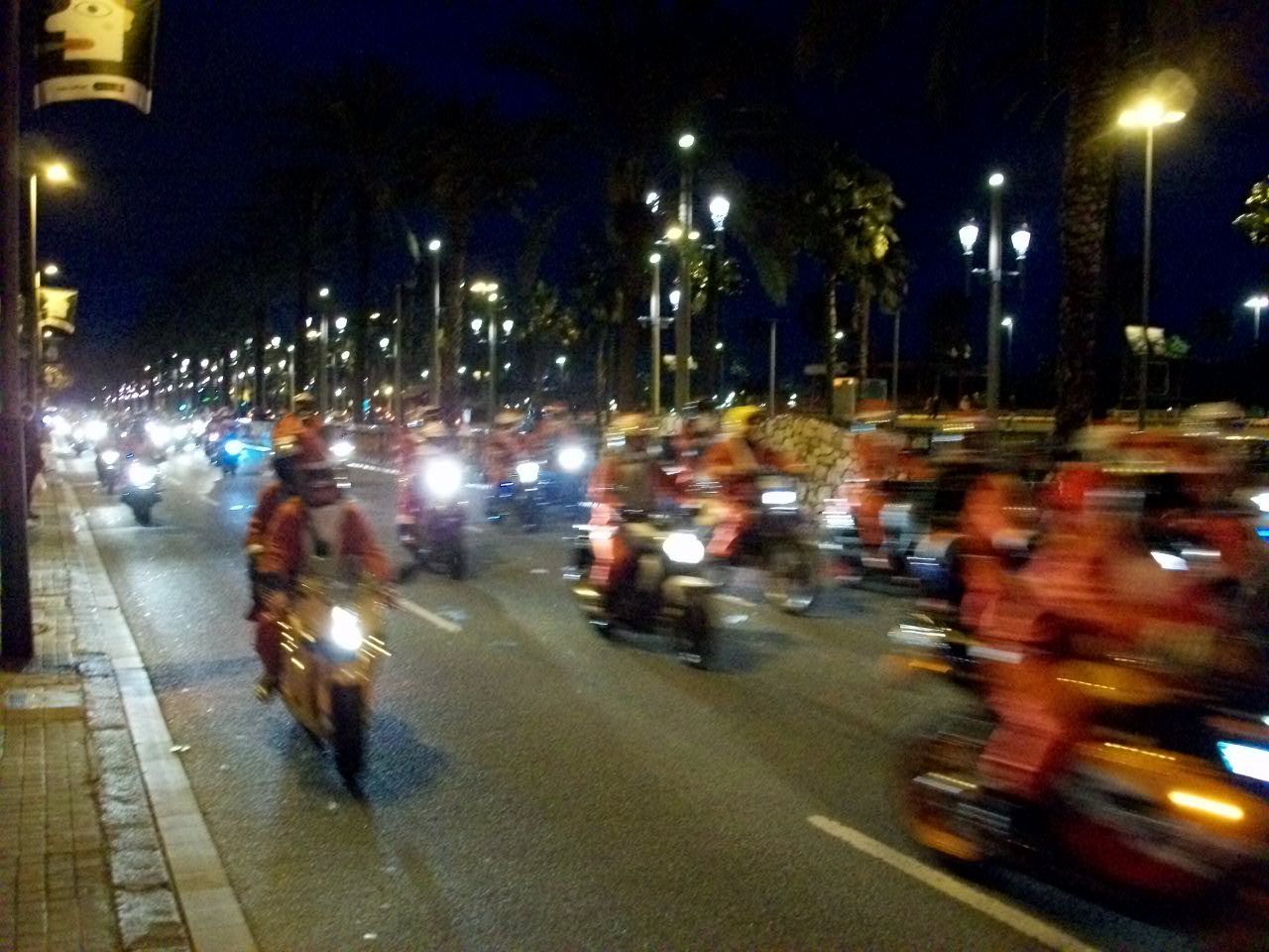Вначале проехали двое полицейских на мотоциклов, а за ними мотоциклисты одетые Дедами морозами. Такое ощущение, что все имеющие мотоцикл барселонцы в этом участвовали.