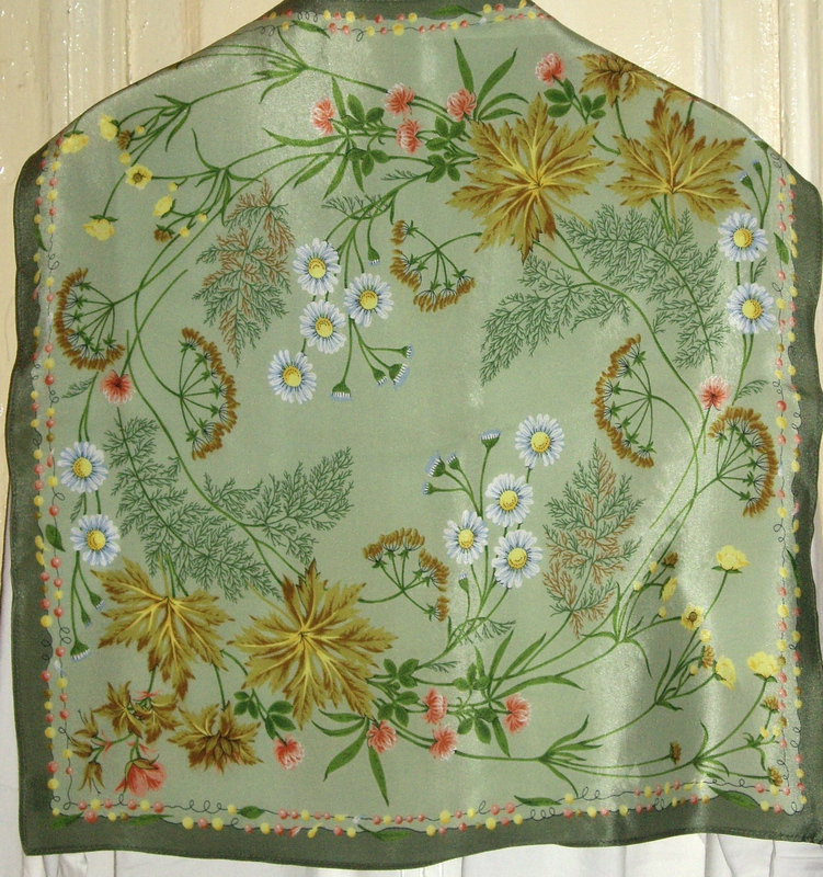 Очень разные: "Разнотравье" - лёгкий, нежный, летний. "Тень на песке"- спокойный, благородный платочек. "Экзотический цветок"- энергичный, дарящий весеннее настроение.