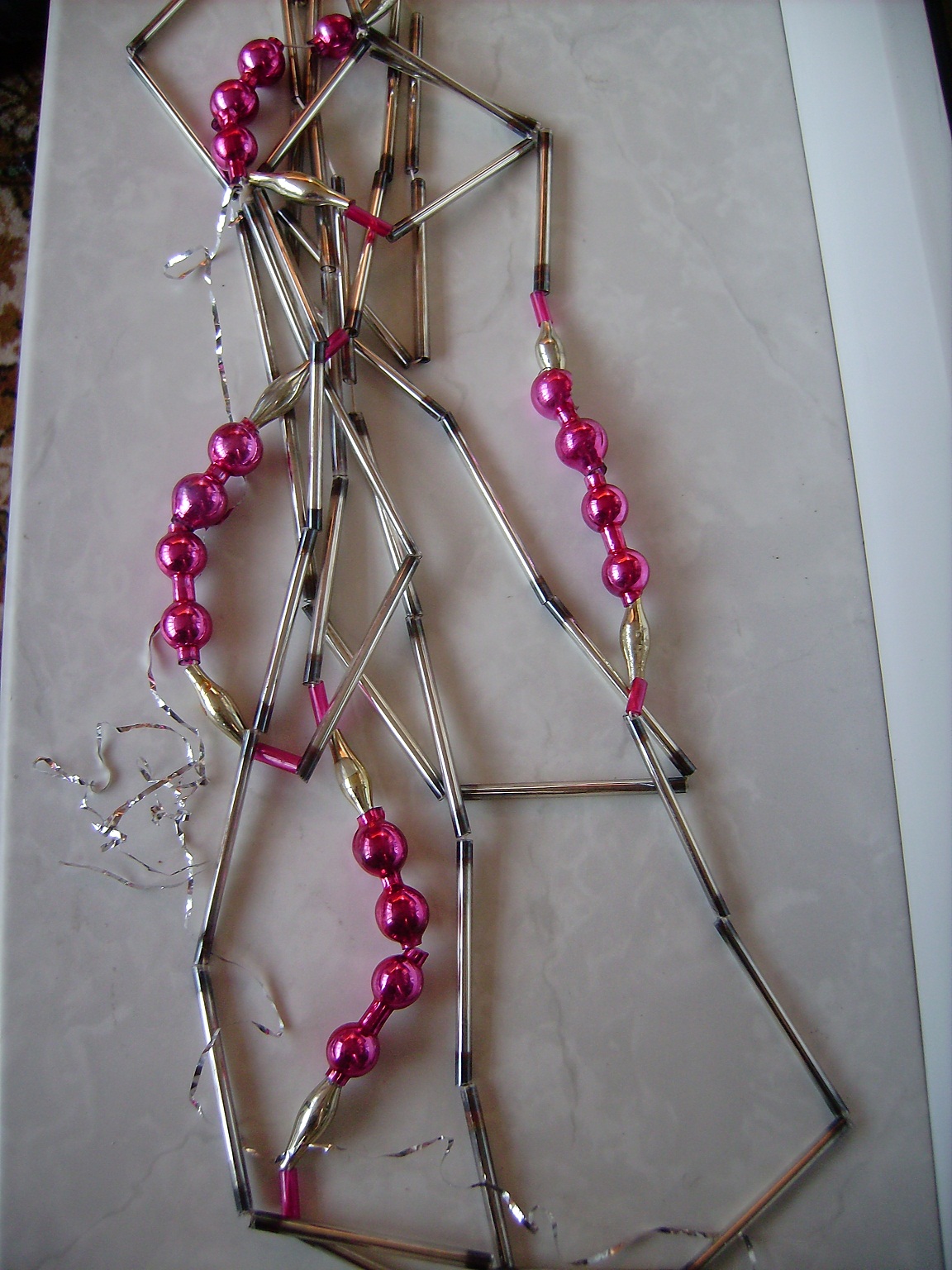Так вот,в прошлом году купила ветки и обошлась старыми припасами, а в этом году захотелось маманьке настоящую ёлку поставить ( она у меня старенькая уже,последние 25 лет жила одна,ёлочку ставила крошечную, наряженную раз и навсегда в 92-г). Накупила игрушек наших разных-прекрасных, и бусы прикупила! теперь в продаже появились реплики тех старых игрушек,многие прям точь-в-точь,а бусы масштабом поменьше вышли,но очень похожи (и ломаются так же). И вот, в детстве эти бусы терпеть не могла,помню свои ощущения, а теперь обрадовалась,как старым приятелям. Они так здорово на ёлочке смотрятся!