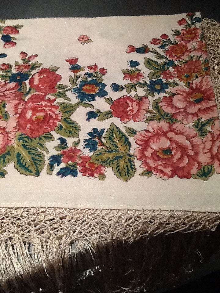 Ткань - хлопок, в точности на таком печатали хб шали в 1970-80-е гг в Павловском Посаде.