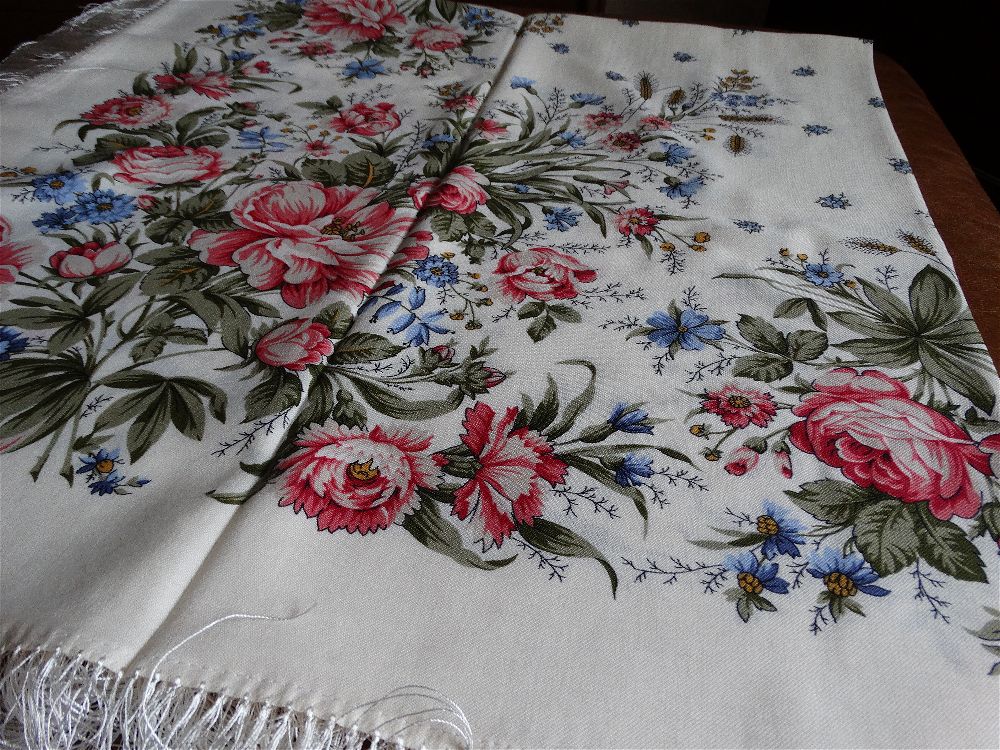 Потом, как сказать, чтобы не было слишком высокопарно, но пусть -- упала в объятья платка "Утренний сад-2" 135см волшебницы Клары Зиновьевой. Ткань шелковистая, особенная (поэтому и стоит подороже). Фон тёплый (вспомнились мода и фильмы 50гг.), ближе к цвету топлёного молока. Рисунок тонкий, изящный. Глядеть на него -- сердце щемит, но так сладко-сладко! Если и не часто буду носить, то иногда -- непременно.