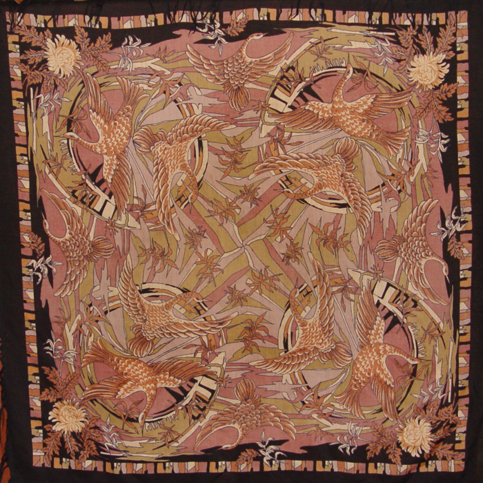 Этот платок был приобретен в 86-90 годах, размер 150х150 шерстяная бахрома. Он до сих пор все такой же красивый. Может кто знает его название и автора рисунка?