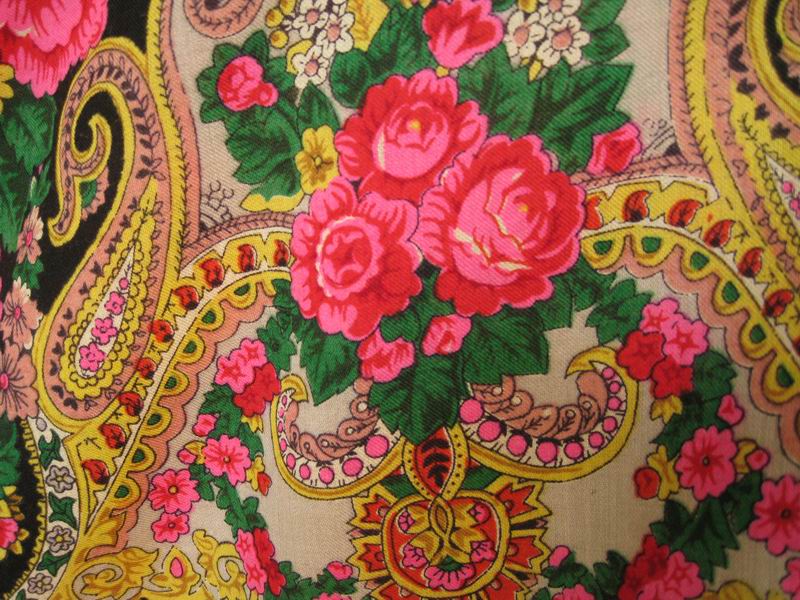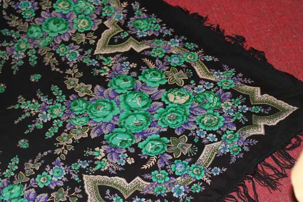 Мама видела, как этот платок изготавливали (набивали рисунок). Она сама пробовала накладывть какой-то штамп на ткань, чтобы печатать одну из красок. Потом на изнанке подписала свою фамилию, чтобы пометить "свою" шаль, и на обратном пути выкупила ее за 90 руб. Такая шаль в те времена была жутчайшим дифицитом!