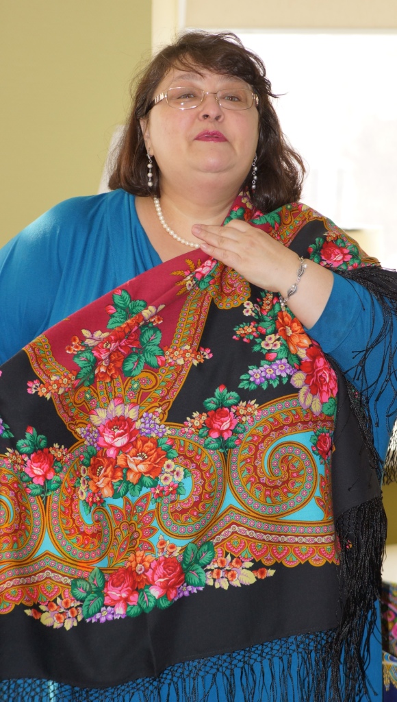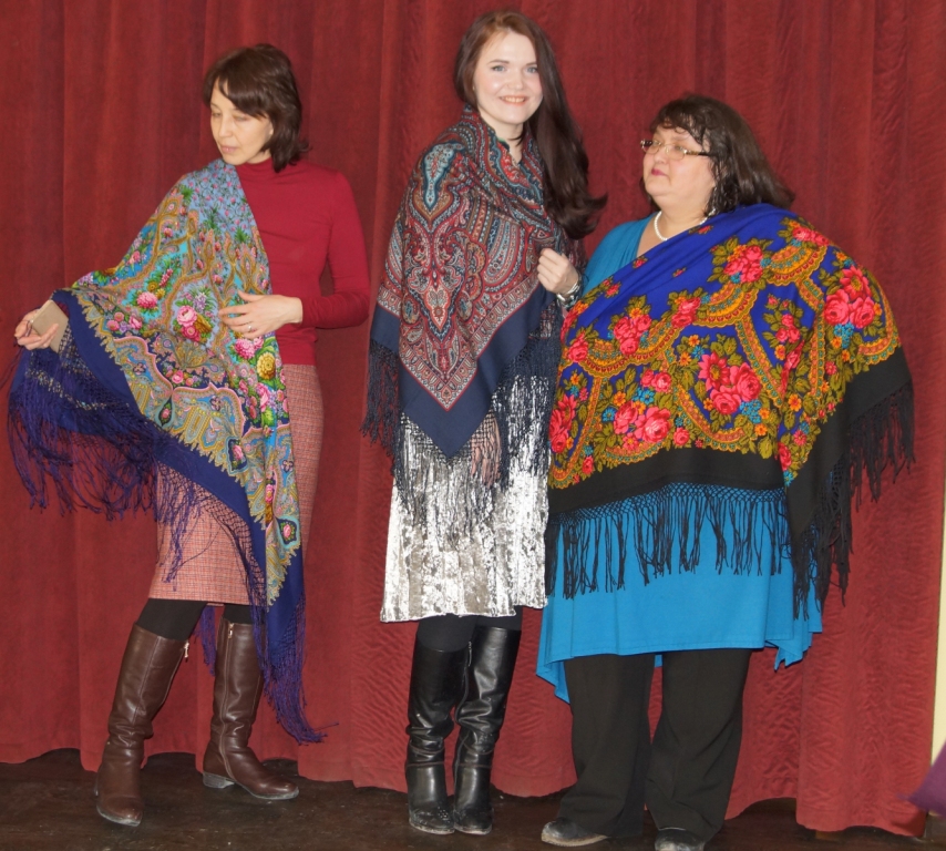 Пошли Елены. Гостью пропускаю вперед. Хочу сказать большое спасибо Лене, за то что она привезла много шалей и платочков старинок. Хоть посмотреть смогли.